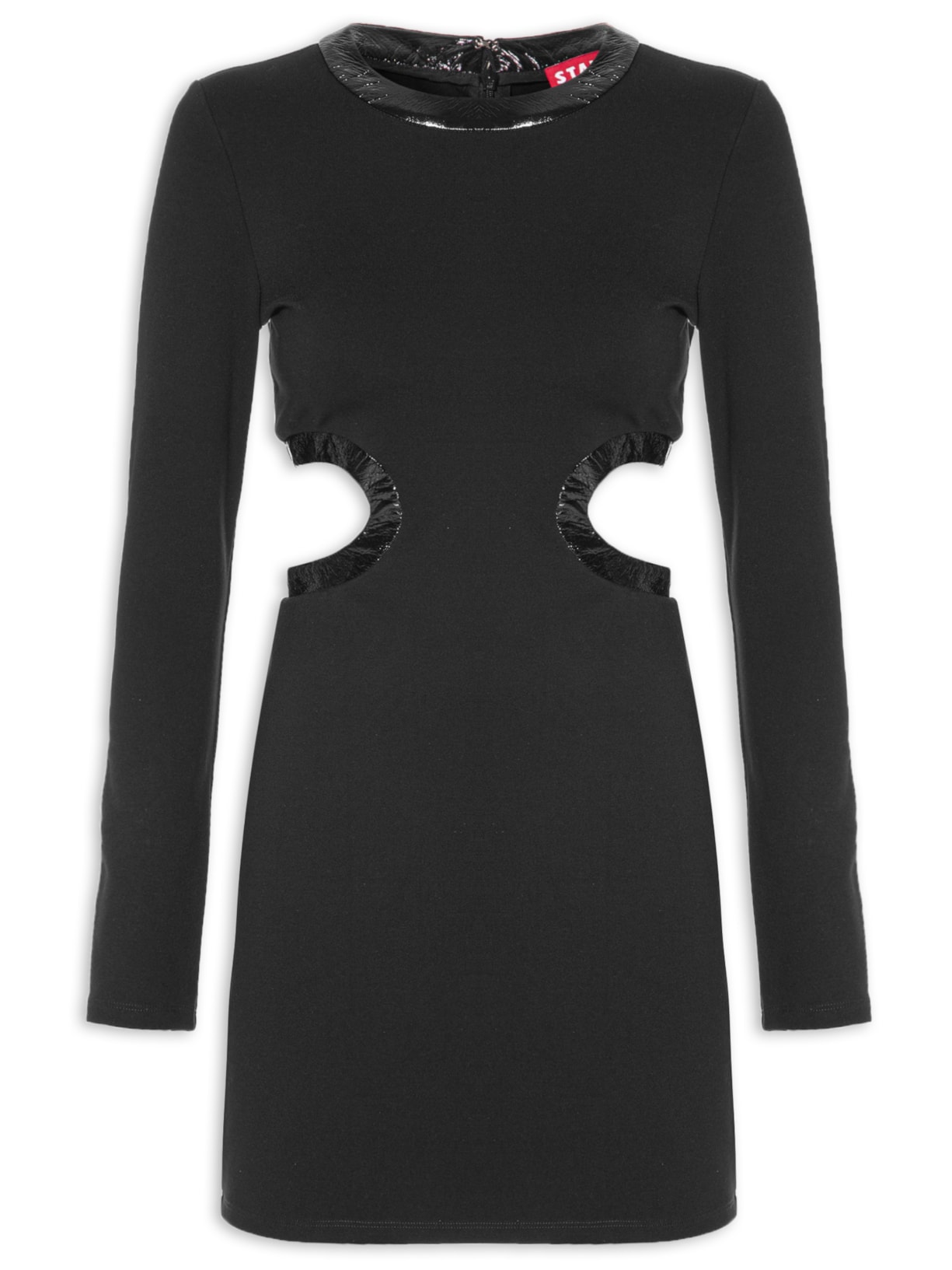 O vestido preto é confeccionado em malha encorpada com média elasticidade. A peça justa na altura do busto e da cintura e solta no comprimento possui decote redondo, mangas longas, recortes na altura da cintura e na parte frontal em tule com transparência e aplicação de aviamentos redondos e espelhados, fenda lateral, comprimento longo e fechamento posterior por zíper invisível.