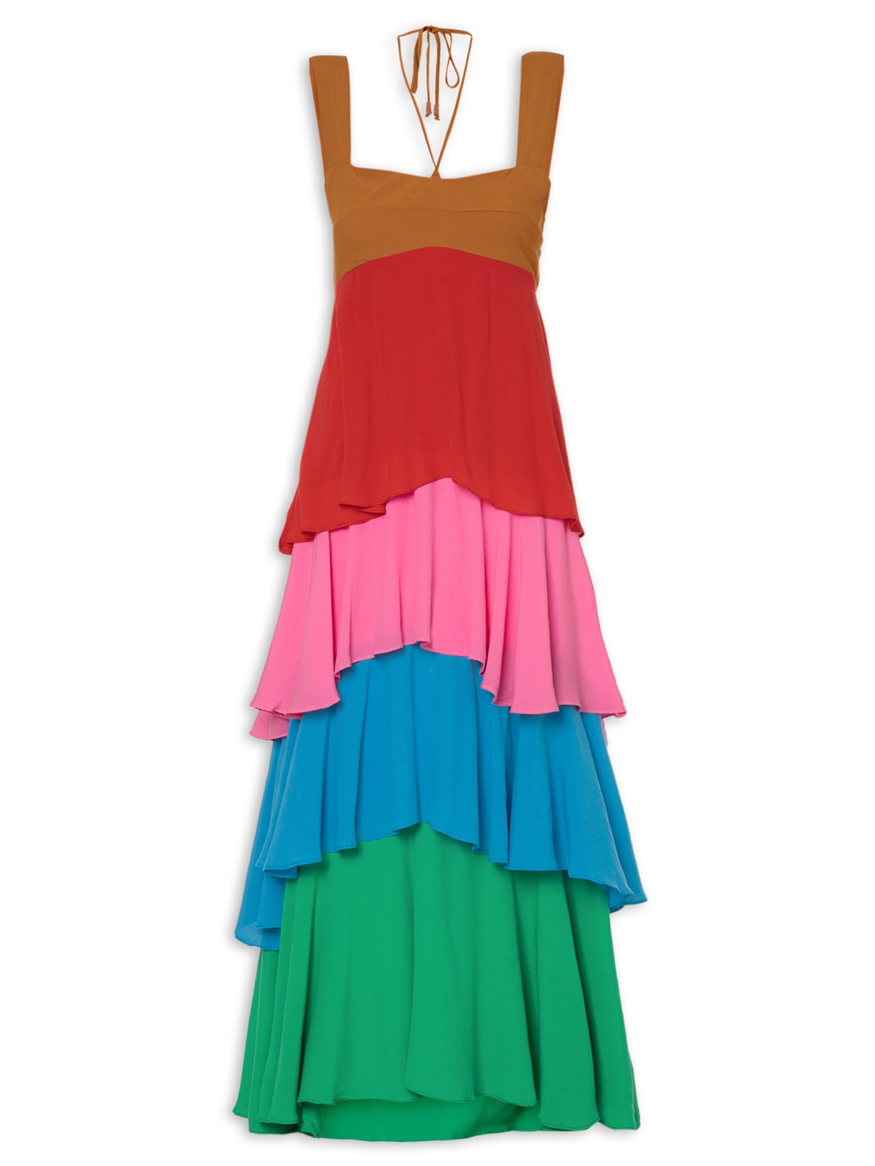 O vestido vermelho é confeccionado em tecido leve. A peça possui decote frontal meia taça e posterior reto, alças médias, cavas estendidas, recorte posterior vazado, recorte posterior em lastex, recortes em camadas com cores contrastantes, comprimento longo, caimento reto, shape solto, acabamento pespontado e fechamento posterior por zíper invisível.