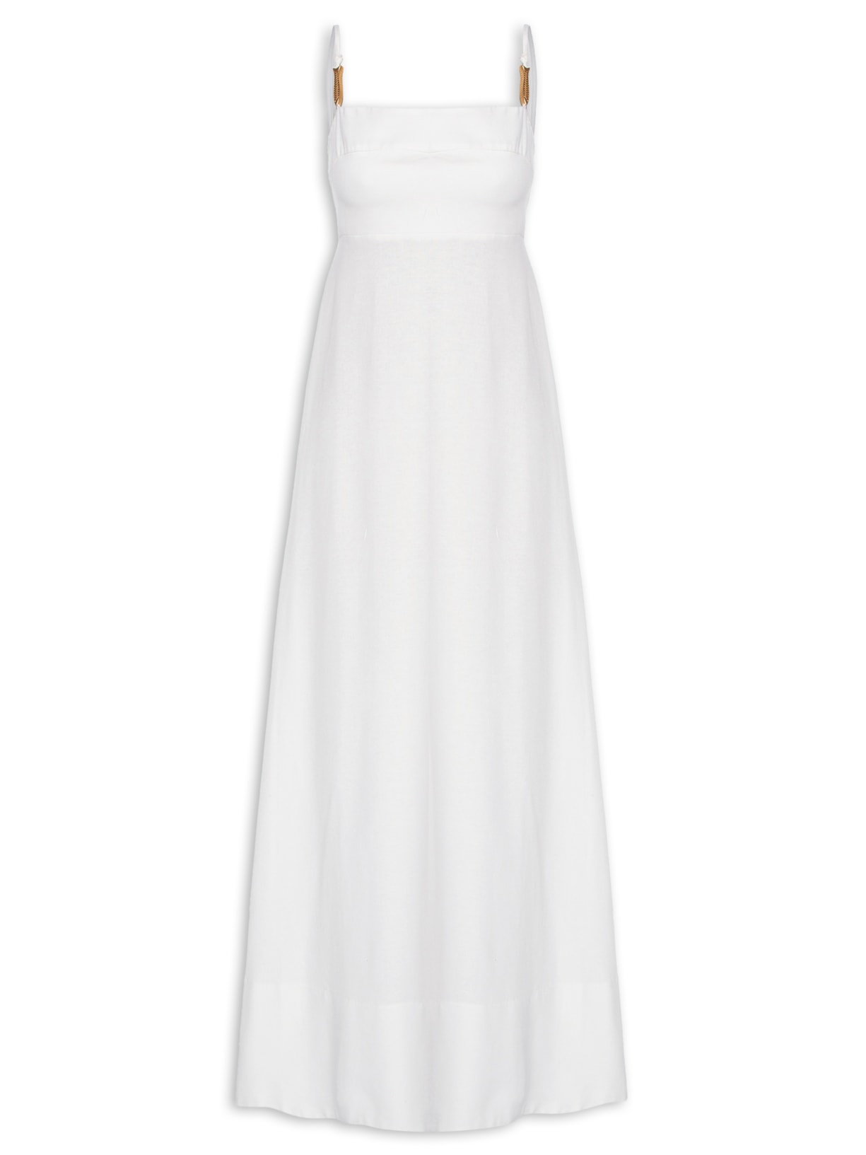 O vestido branco é confeccionado por tecido leve com toque em linho sem elasticidade. A peça solta ao corpo possui decote quadrado, alças finas estendidas para amarração e com aplicação figurativa metalizada, recorte frontal na altura do busto, recorte posterior em lastex, fechamento por amarração posterior e comprimento longo.