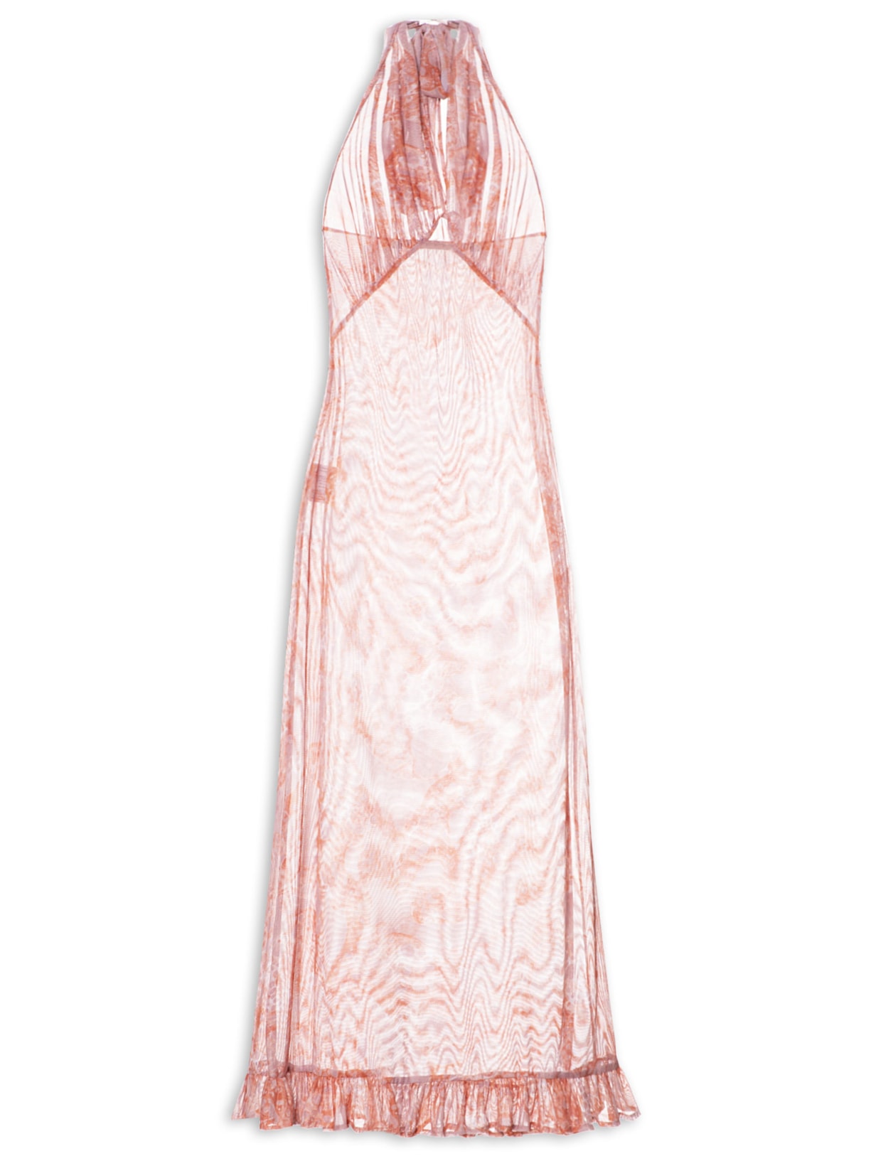 O vestido rosa é confeccionado em tule de alta elasticidade. A peça justa ao busto e solta no comprimento de modelo frente única possui decote V, alças médias alongadas para amarração posterior, recorte frontal com efeito franzido, barra com recorte de babados, estampa abstrata em tons contrastantes, transparência, sem forro e comprimento longo.