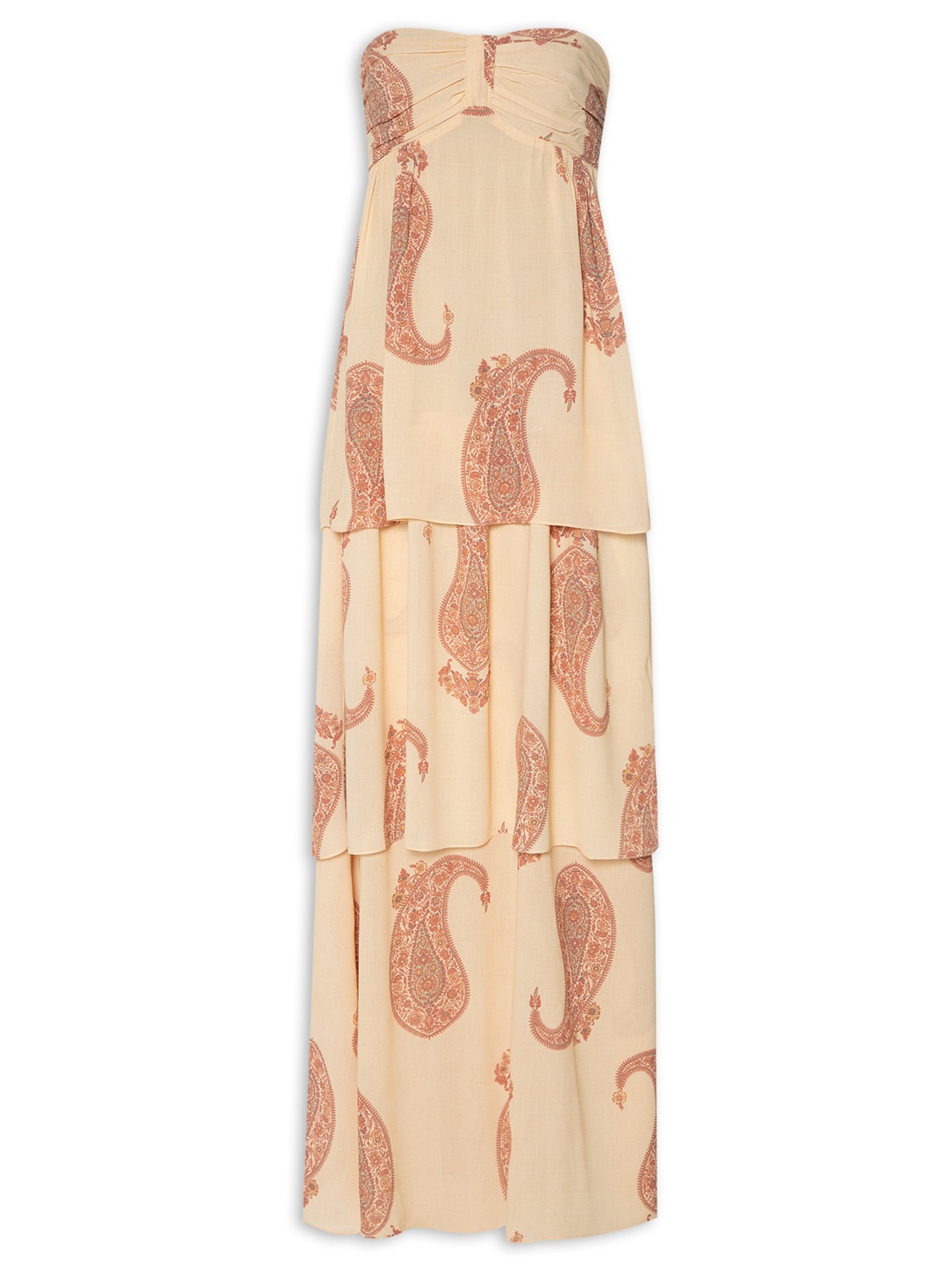 O vestido bege é confeccionado por tecido leve sem elasticidade. A peça solta ao corpo de modelo tomara que caia possui decote coração, detalhes franzidos na altura do busto, recortes sobrepostos em camadas, estampas paisley em cor contrastante, recorte posterior em lastex, forro, leve transparência e comprimento longo.