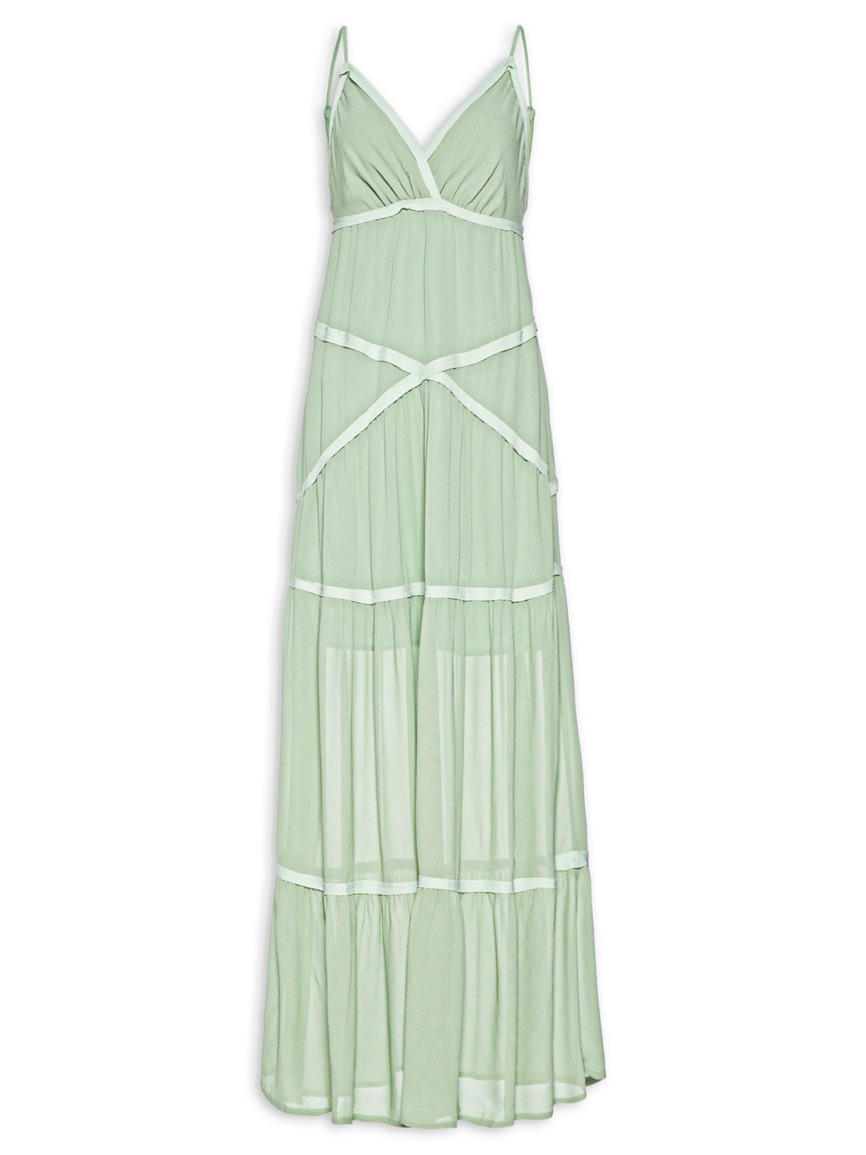 O vestido verde é confeccionado em crepe sem elasticidade. A peça solta ao corpo, possui decote em V, alças finas com regulagem, recortes frontais e posteriores com detalhe em tom contrastante aplicado e detalhes franzidos, leve transparência inferior, comprimento longo, forro e fechamento posterior por zíper invisível.