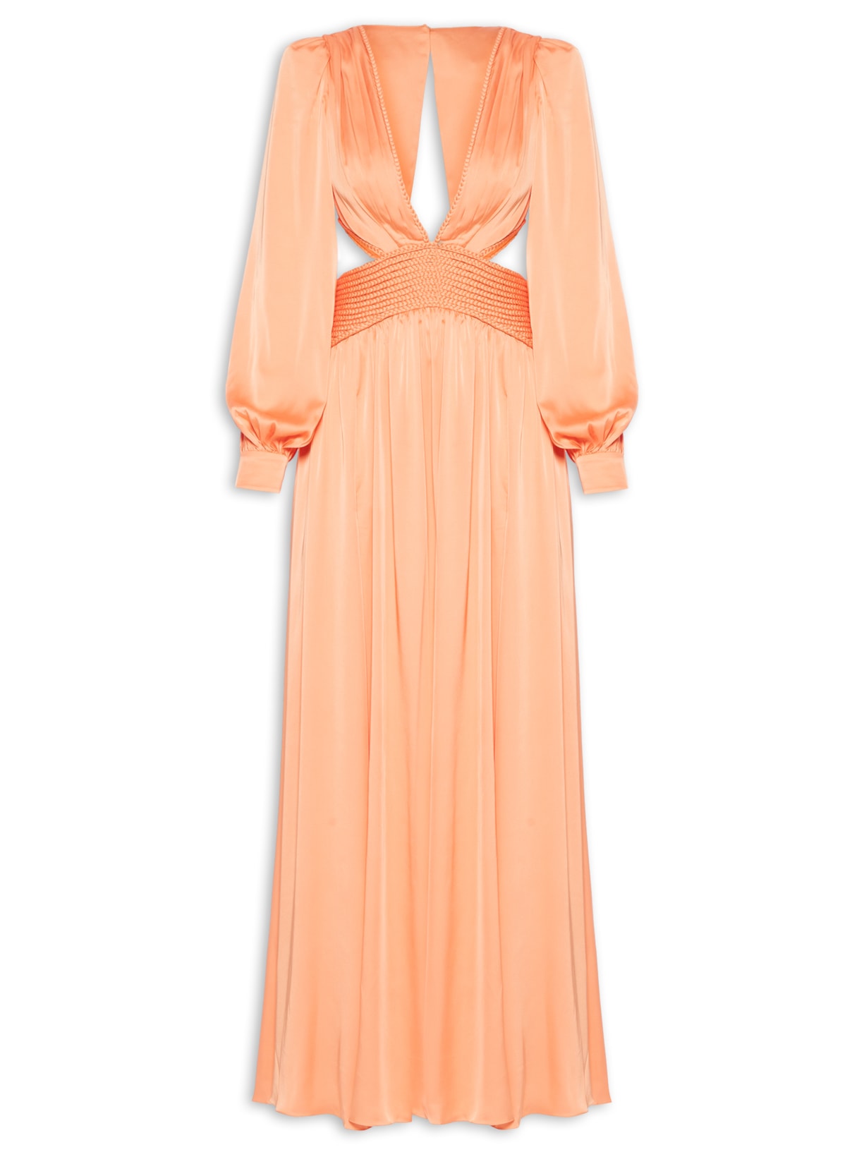 O vestido laranja é confeccionado por tecido leve acetinado sem elasticidade. A peça justa na altura do busto e solta no comprimento possui decote V profundo, mangas longas com detalhe de franzidos na altura dos ombros, ajuste e abotoamento nos punhos, enchimento na altura dos ombros, sem bojo, recorte posterior, recortes vazados na altura da cintura, pregas frontais na altura dos ombros e da cintura, recorte na altura da cintura e decote com detalhe de trançado, recorte frontal com fenda, comprimento longo e fechamento posterior por zíper e botão.