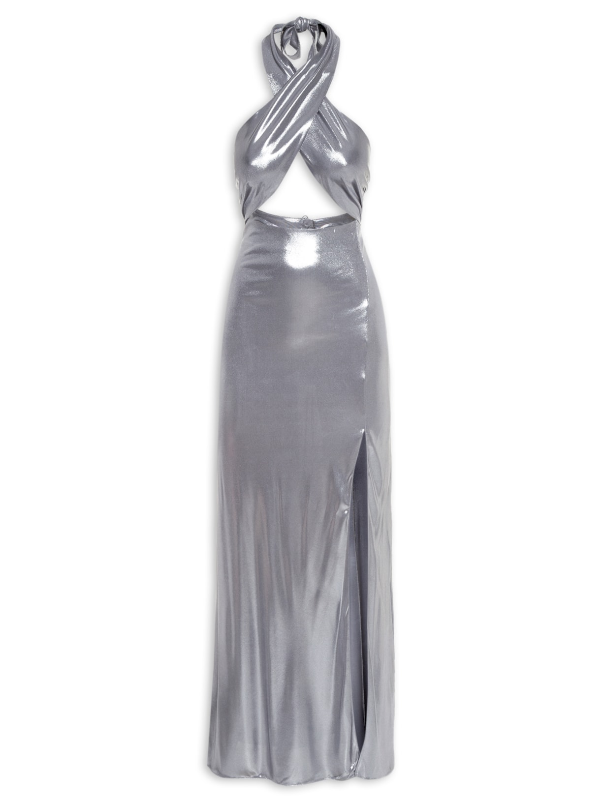 O vestido prata é confeccionado em tecido leve com superfície metalizada. A peça possui decote assimétrica. alças médias, recorte frontal vazado, barbatanas laterais, elástico embutido na altura da barra, fenda frontal, comprimento logo, shape justo, caimento reto e acabamento pespontado.
