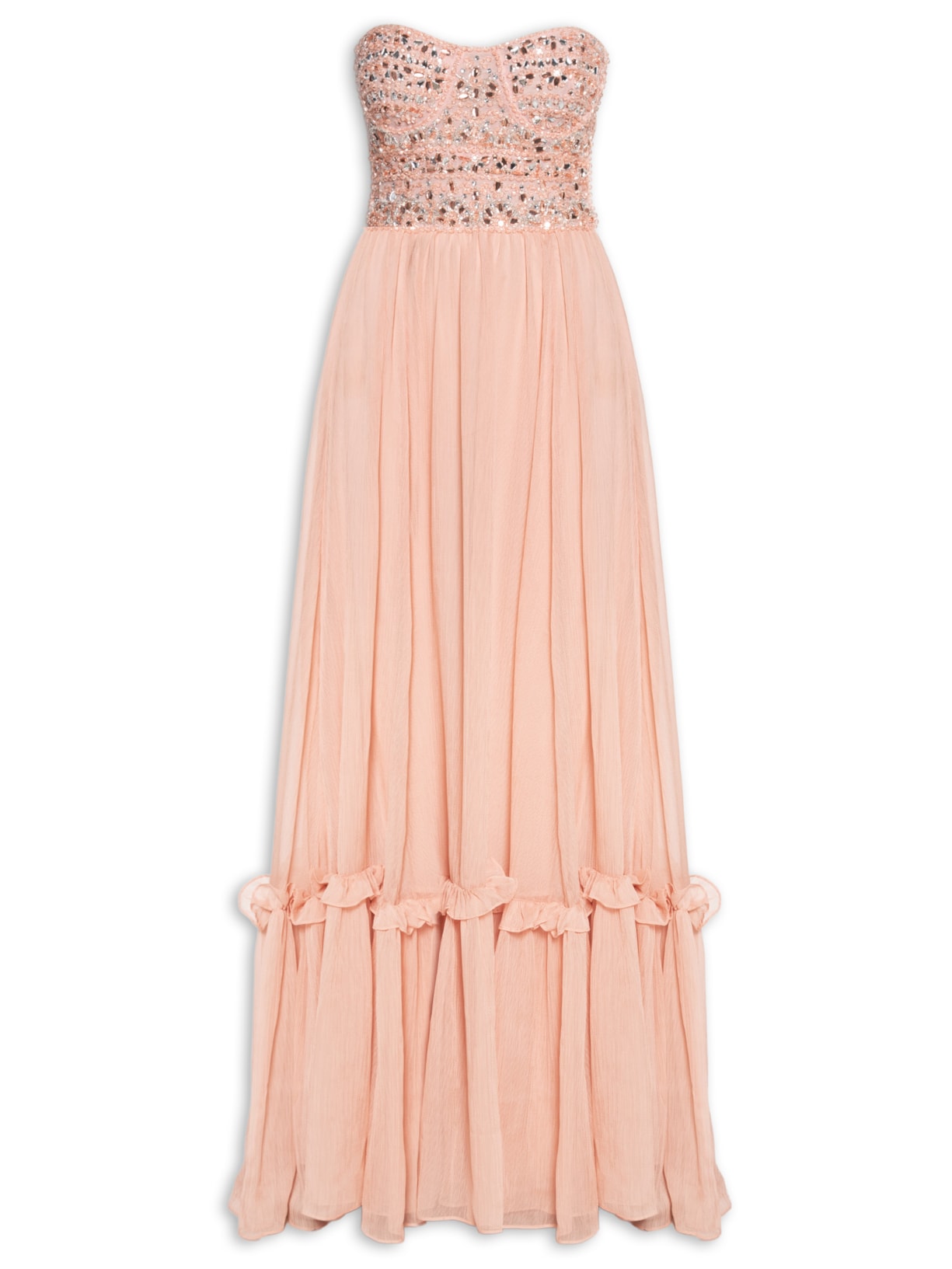 O vestido rosa é confeccionado em chiffon sem elasticidade. A peça solta ao corpo de modelo tomara que caia possui decote coração, recortes na parte frontal, aros de sustentação embutidos, recorte com efeito de babados, aplicaçao de bordado de pedrarias na parte frontal, forro, comprimento longo e fechamento posterior por zíper.