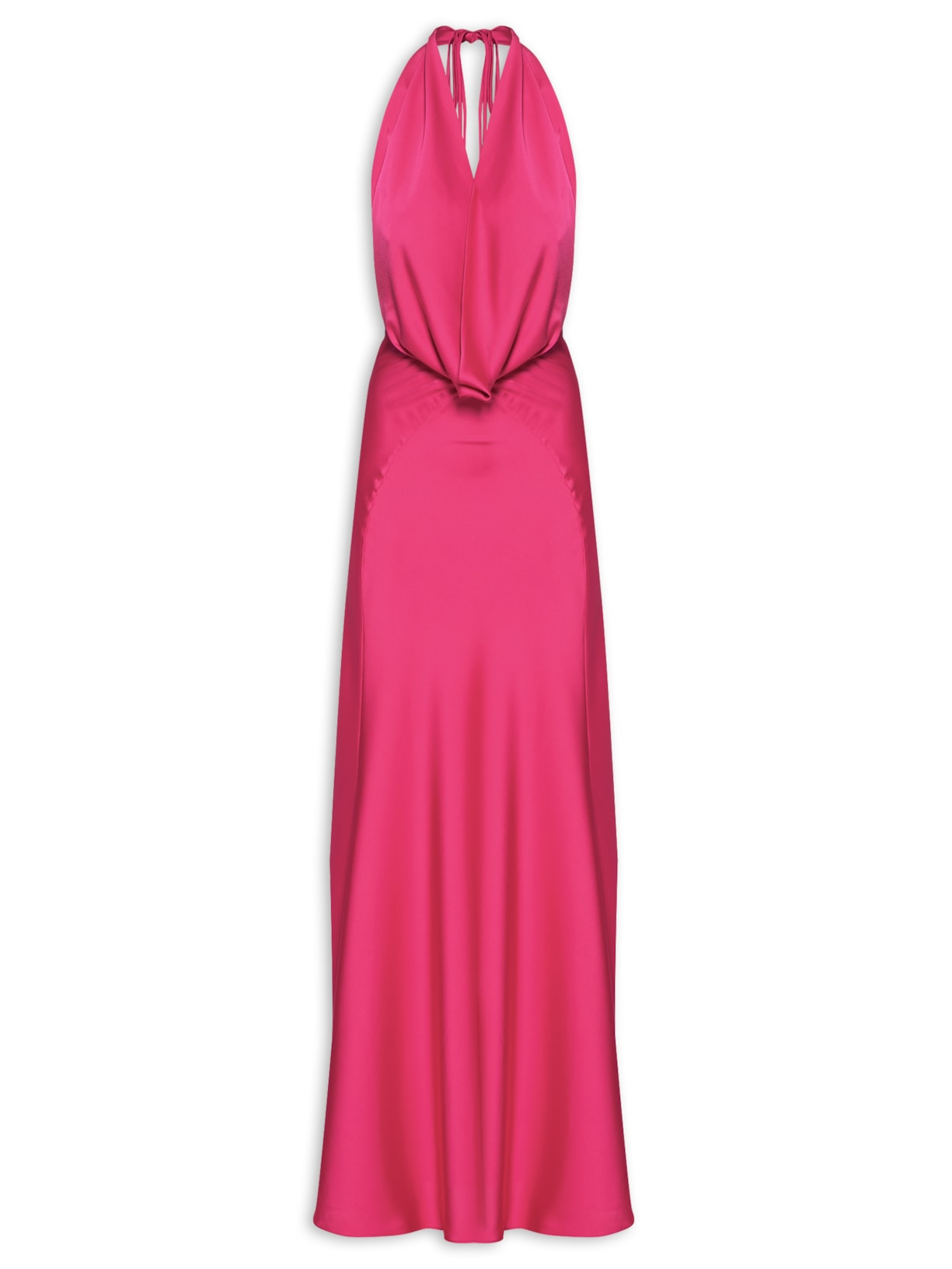 O vestido rosa é confeccionado em tecido leve com superfície acetinada sem elasticidade. A peça solta ao corpo, de modelo frente única, possui decote degagê com transpasse fontal, alças duplas finas estendidas para amarração posterior, recortes frontais e posteriores e comprimento longo.