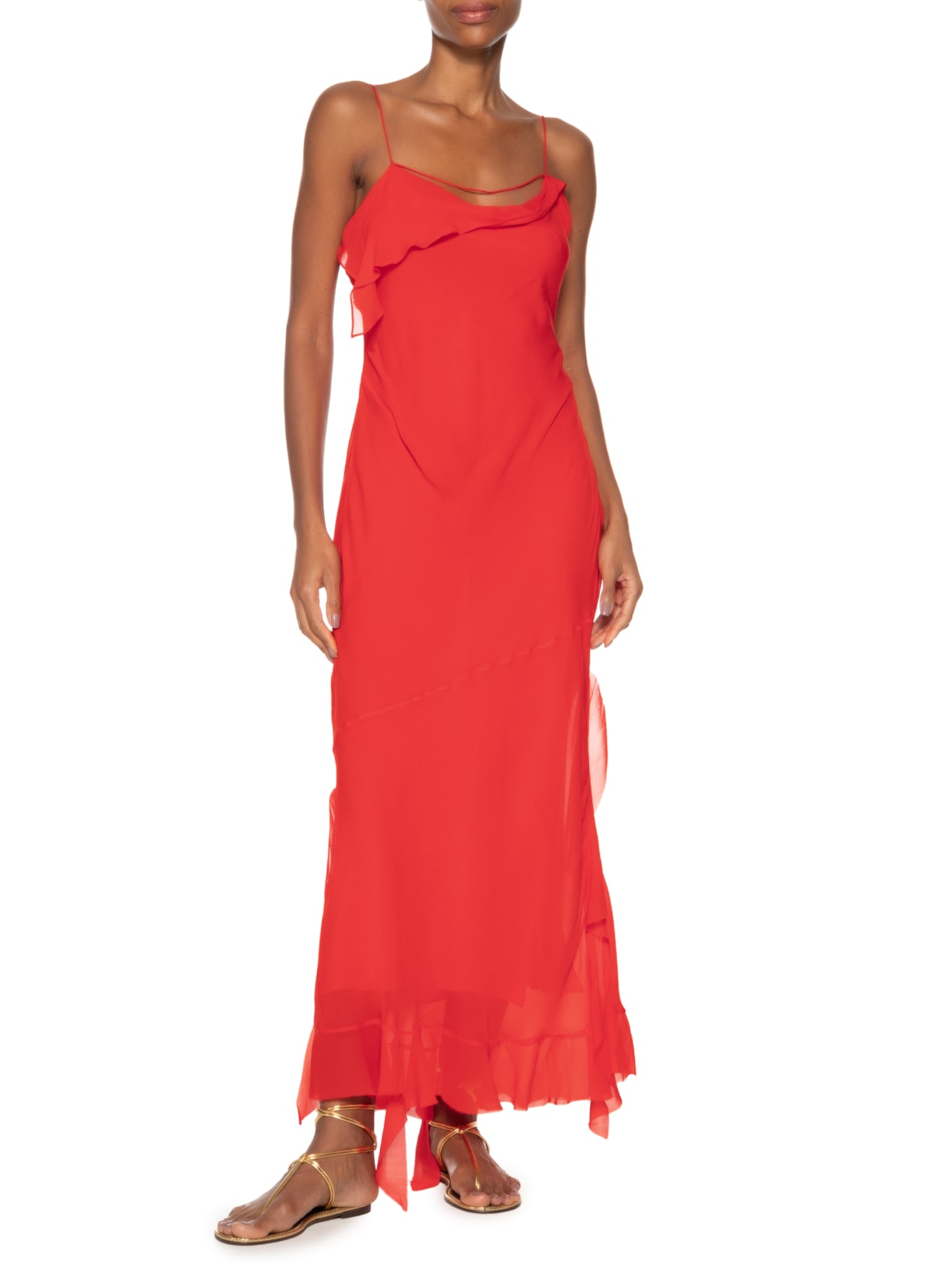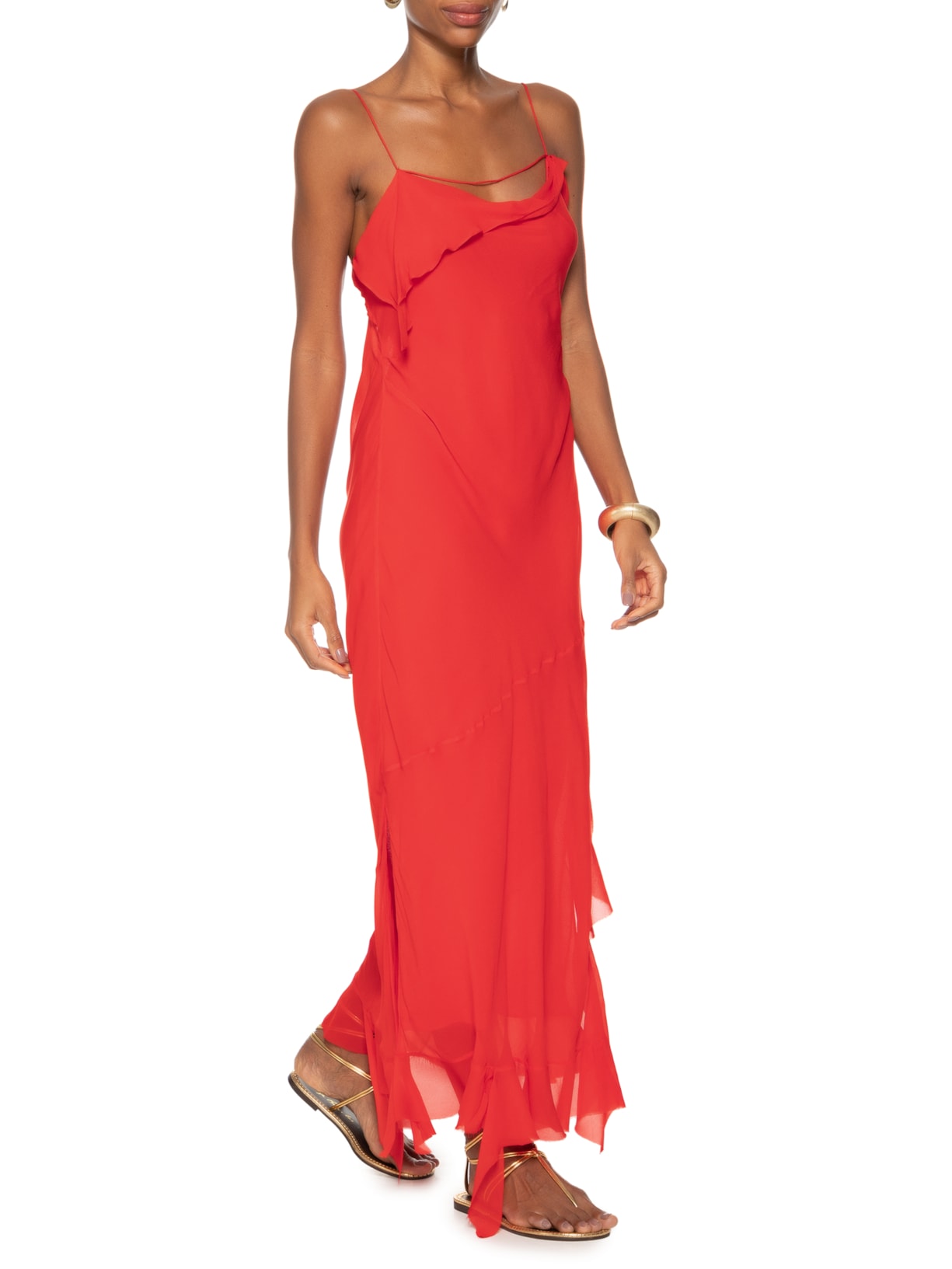 O vestido vermelho é confeccionado em tecido leve sem elasticidade. A peça solta ao corpo possui decote desconstruído, alças finas, fendas laterais, babados frontais, barra assimétrica e comprimento longo.