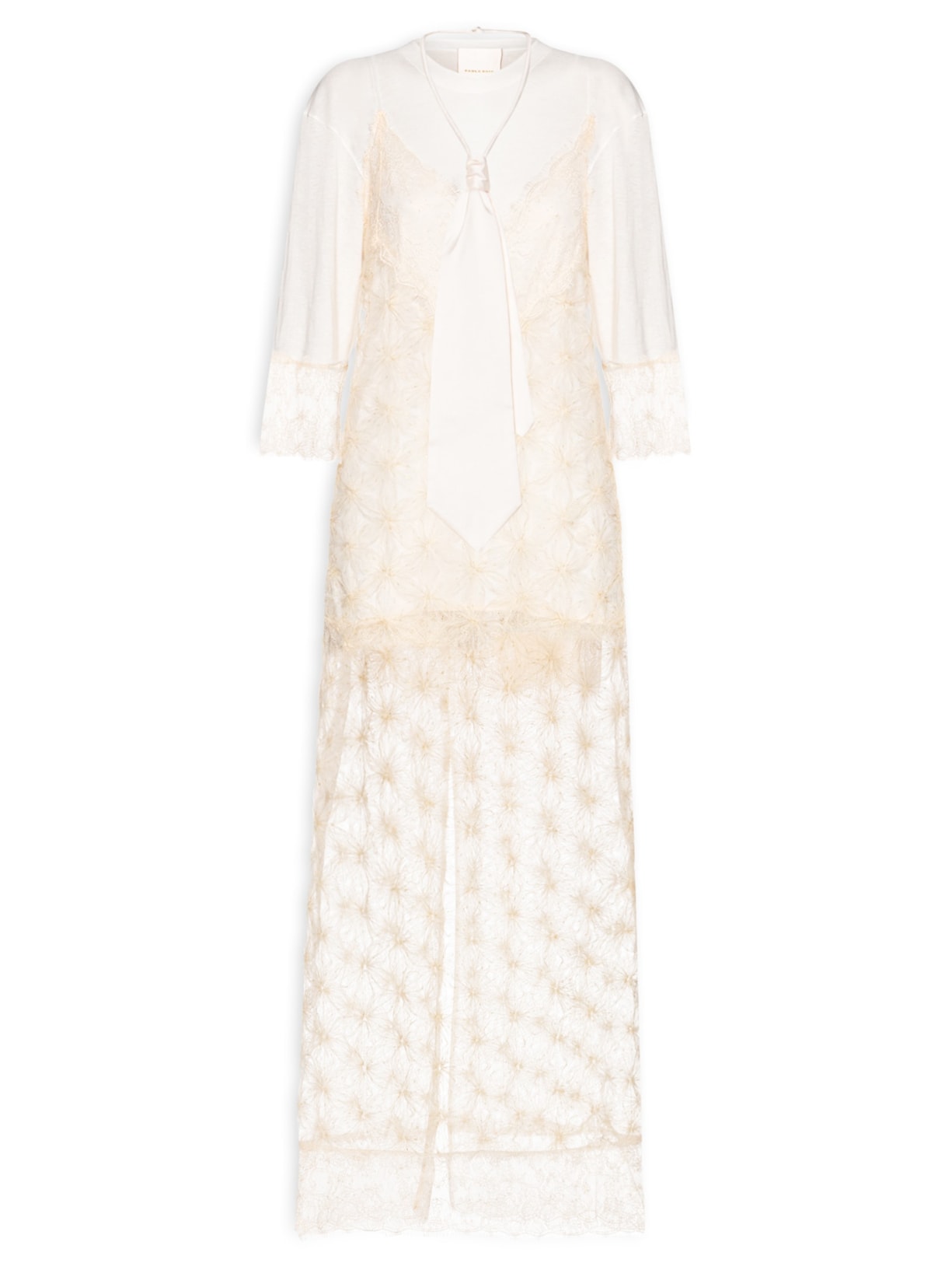 O vestido off white é confeccionado em tule com superfície em bordados florais e sem elasticidade. A peça solta ao corpo possui decote em V com abertura e fechamento por botões, alças finas, transparência e comprimento longo. Acompanha forro em malha leve com decote arredondado, mangas longas com renda aplicada nos punhos, comprimento curto e uma gravata na cor off white para uso opcional.