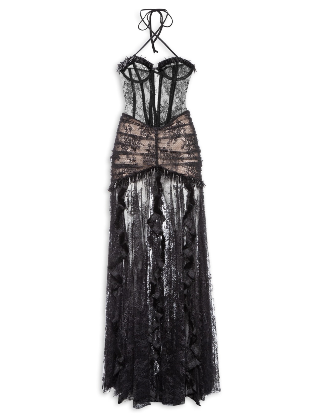O vestido preto é confeccionado em renda de baixa elasticidade. A peça justa ao busto e solta no comprimento possui decote coração com aplicação de canutilhos e miçangas, alças em tiras finas alongadas para amarração cruzada, recorte frontal vazado na altura do busto, recortes na parte superior com barbatanas embutidas, recorte na altura do quadril com efeito franzido e aplicação de canutilhos e miçangas, parte inferior com aplicação de babados com acabamento em franjas, trama floral com recortes vazados, forro na altura do quadril, comprimento longo e fechamento posterior por zíper.