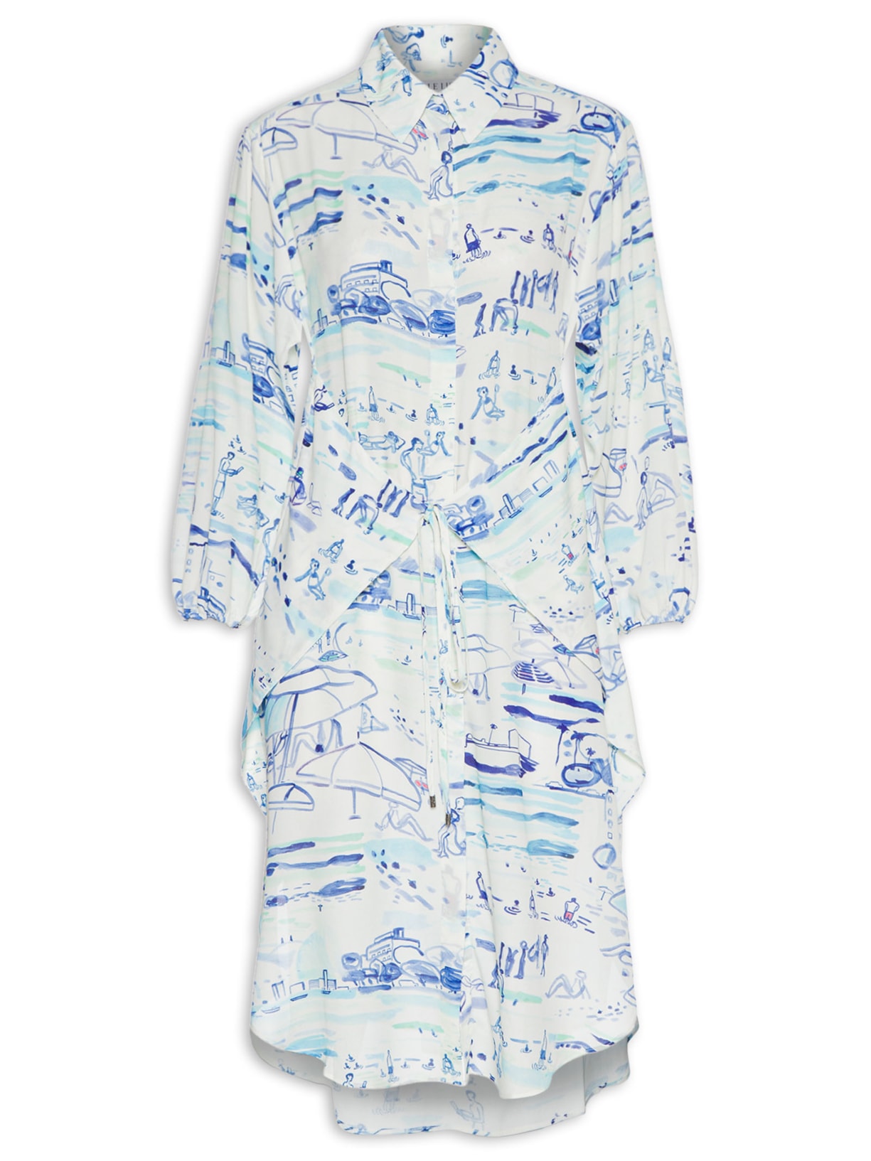 O vestido azul é confeccionado em tecido leve sem elasticidade. A peça solta no corpo possui colarinho simples, ombros estendidos, mangas longas bufantes, logo da marca aplicado em metal na parte posterior e recorte com detalhes de pregas, recortes laterais estendidos com cordão para amarração frontal, barra mullet* arredondada, fendas laterais, estampa figurativa de praia em tons contrastantes, leve transparência, comprimento midi e fechamento frontal por botões com vista sobreposta.