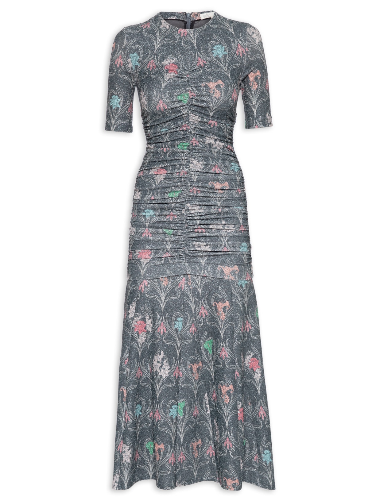 O vestido cinza é confeccionado em malha leve com fios de lurex com média elasticidade. A peça justa ao corpo possui decote redondo, mangas curtas, recortes frontais e posteriores com efeito drapeado, padronagem floral em cor contrastante, fechamento por zíper posterior e comprimento midi.