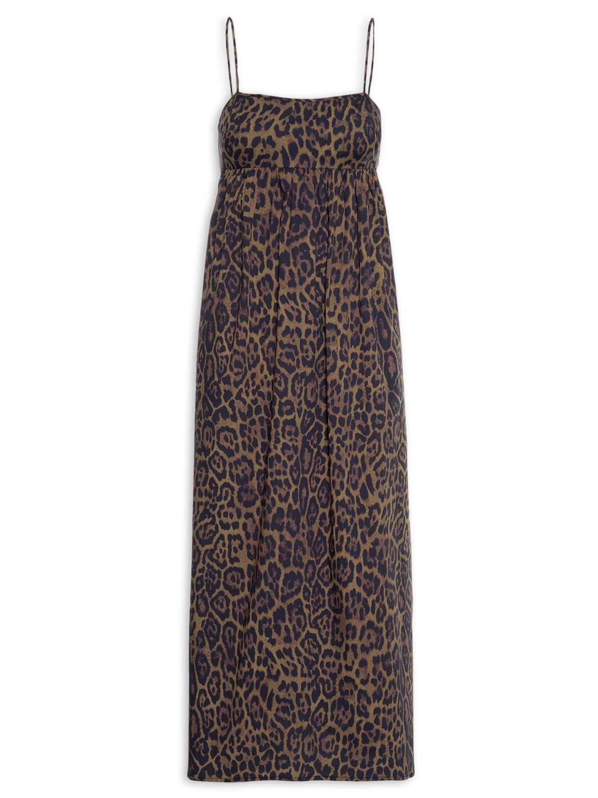 O vestido animal print é confeccionado em tecido leve. A peça possui decote reto, alças finas, recorte posterior vazado com detalhe de amarração, detalhe de franzidos, shape solto, comprimento midi, caimento reto, acabamento pespontado e fechamento posterior por amarração.