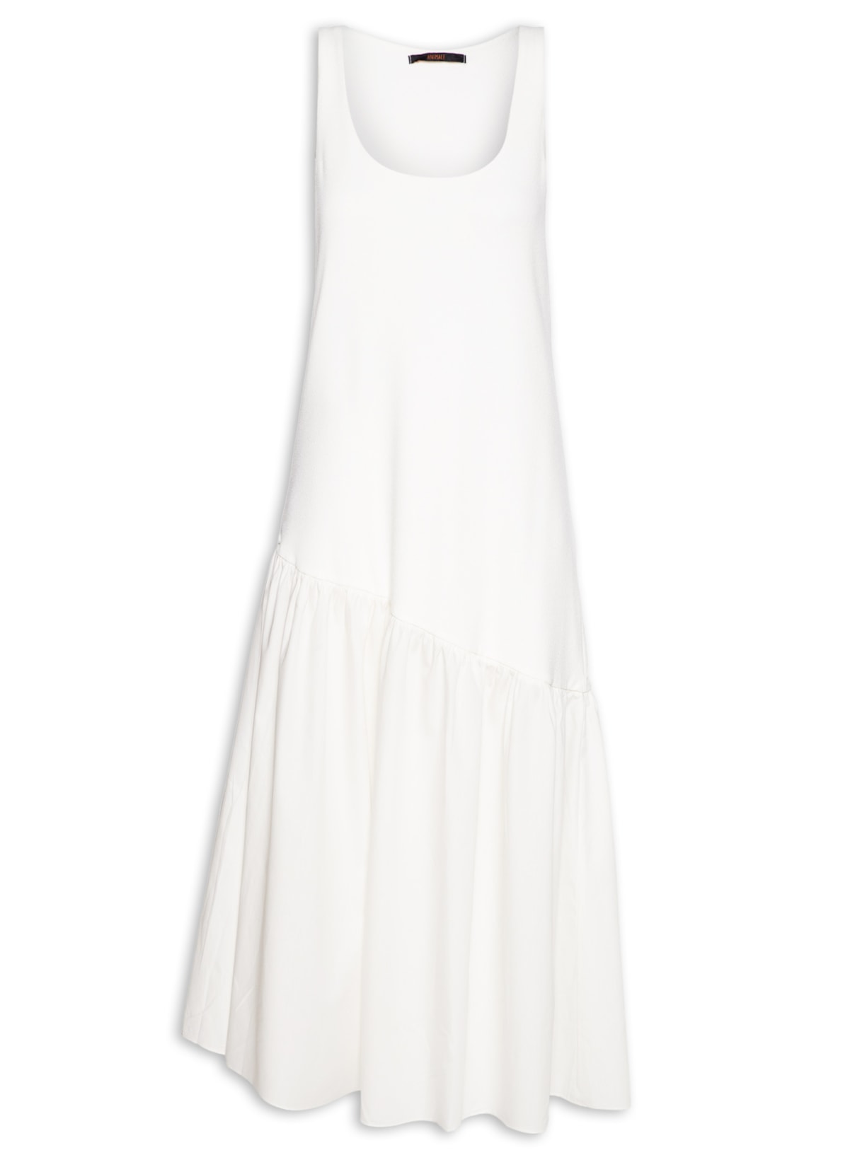 O vestido branco é confeccionado em malha leve com média elasticidade. A peça solta ao corpo possui decote redondo, alças finas, cavas regulares, recorte assimétrico frontal e posterior, comprimento midi e saia em tricoline.