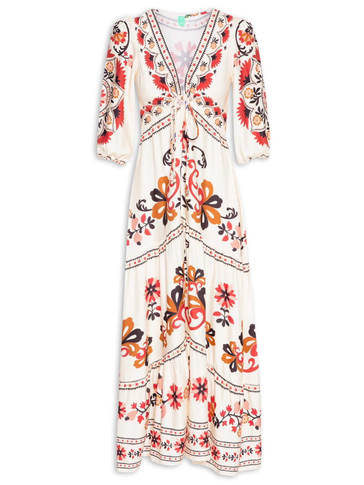 O vestido vermelho é confeccionado em tecido leve sem elasticidade. A peça solta ao corpo possui decote V com detalhe de tiras alongadas embutidas para amarração frontal, mangas 3/4 com elástico embutido na barra, elástico embutido na parte posterior, recortes no comprimento com efeito franzido, mix de estampas em cores contrastantes, forro superior e comprimento midi.
