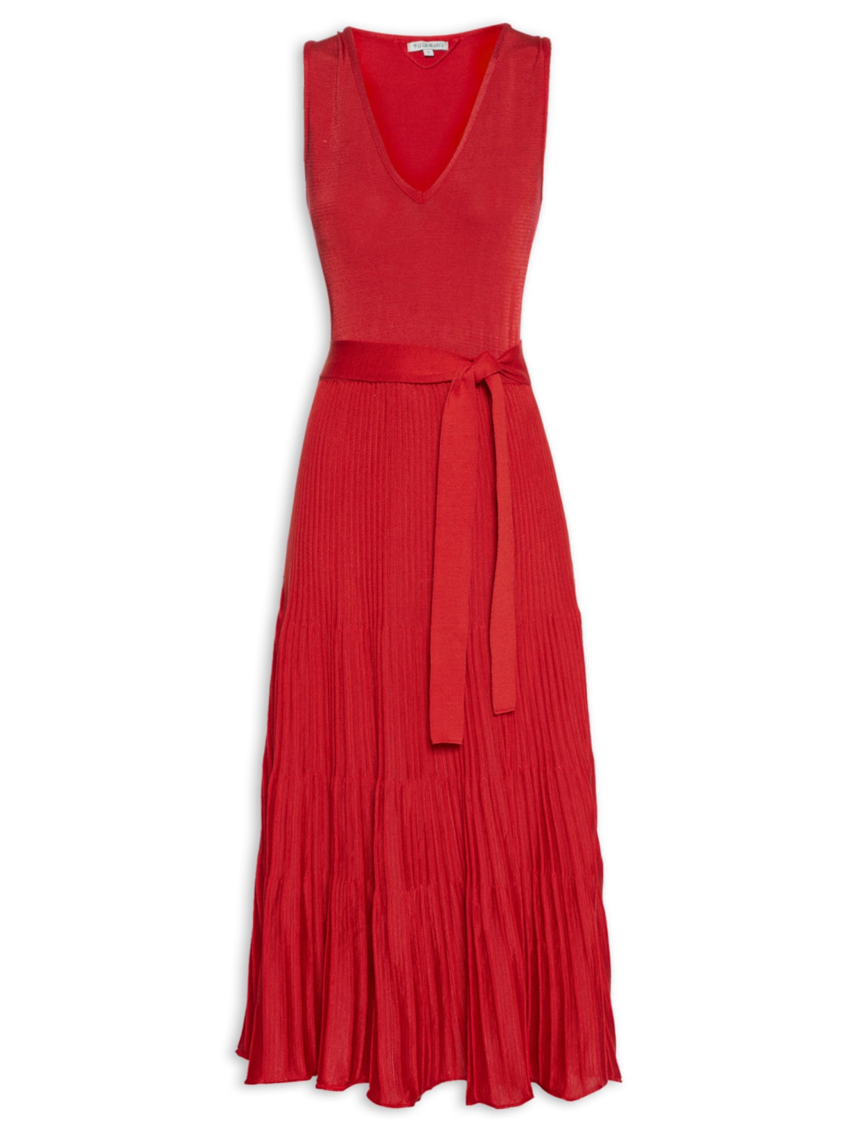 O vestido vermelho é confeccionado em tricot com média elasticidade. A peça solta ao corpo possui decote v, alças largas, saia com detalhes em vivos, comprimento midi, e tag da marca aplicada em metal na parte posterior. Acompanha cinto em mesmo tecido para uso opcional.