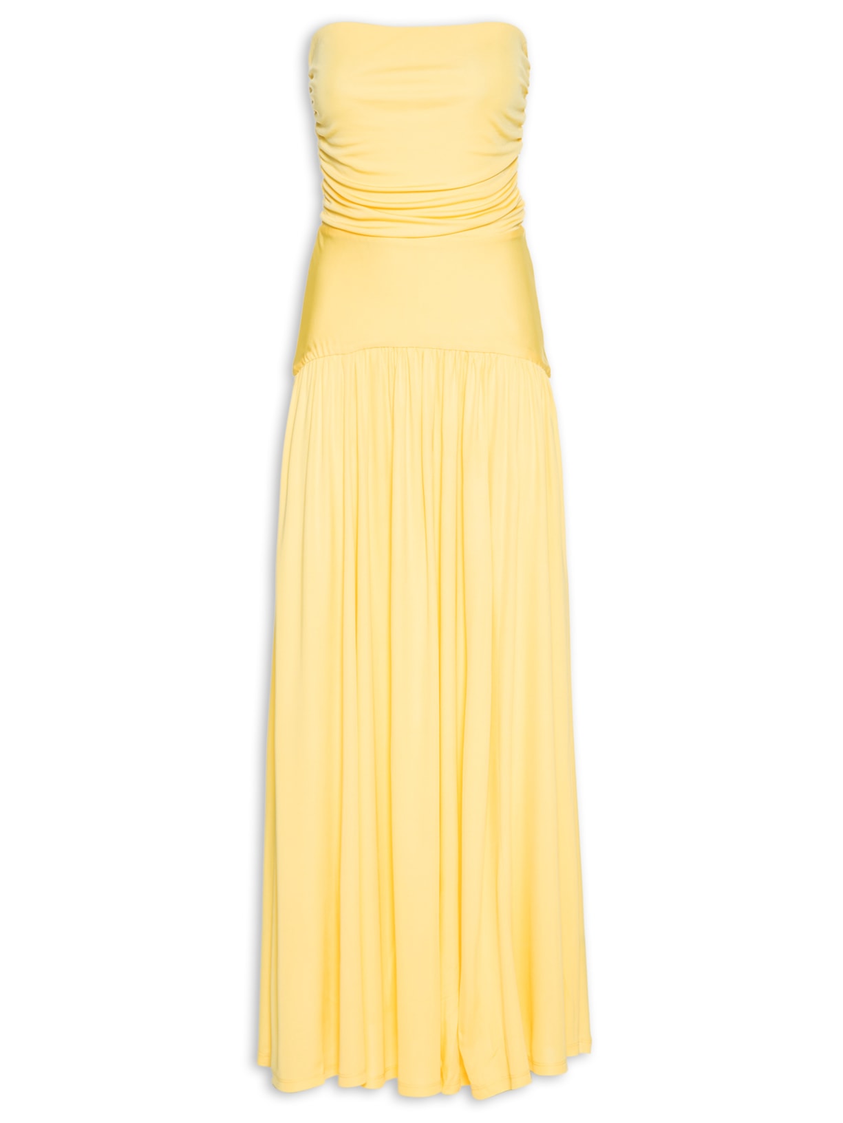 O vestido amarelo é confeccionado em tecido leve sem elasticidade. A peça de modelo tomara que caia justa no busto e solta ao corpo possui decote reto, recortes posteriores e frontais, sem bojo, franzidos nas partes laterais, posterior e na altura do quadril, meio forro, comprimento longo e fechamento posterior por zíper invisível.
