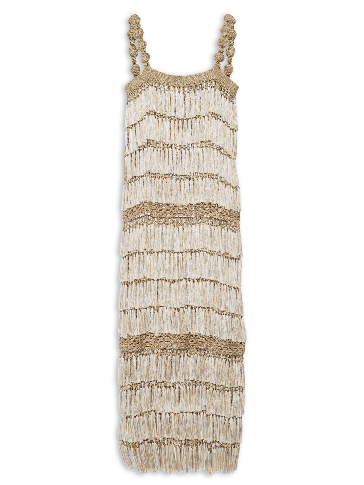 O vestido dourado é confeccionado em crochê com superfície em fios de lurex. A peça possui decote quadrado, algas finas com detalhes esféricos, transparência, franjas aplicadas em camadas, comprimento midi, shape solto, caimento reto e acabamento canelado.