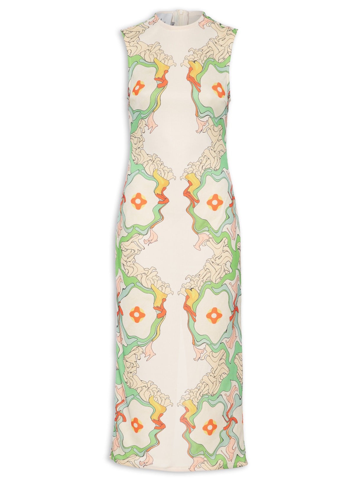 O vestido bege é confeccionado em malha canelada com alta elasticidade. A peça justa ao corpo possui decote redondo, cavas regulares, recorte posterior com fenda, estampa abstrata em cores contrastantes, comprimento midi e fechamento posterior por zíper invisível.