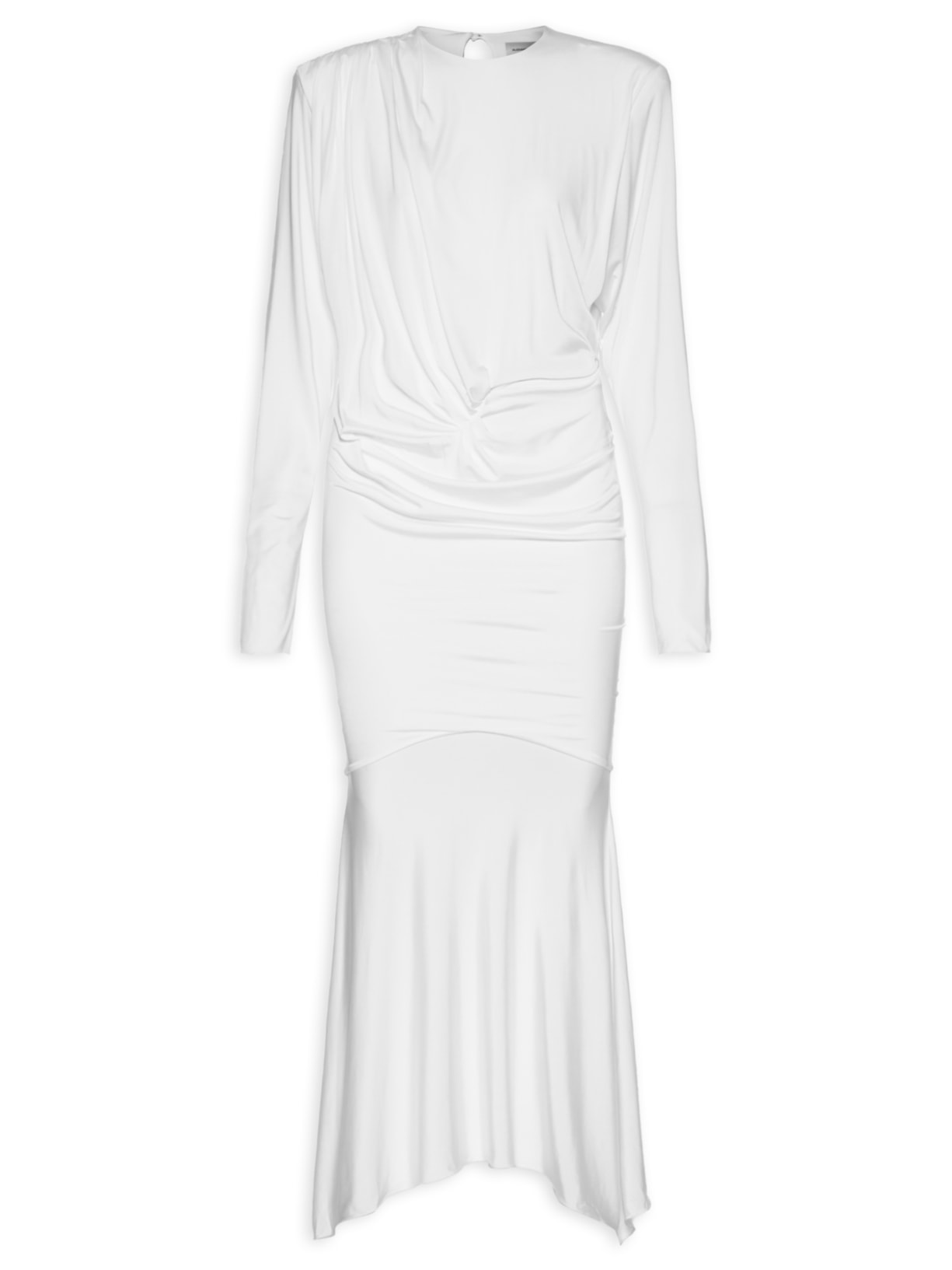 O vestido off white é confeccionado em malha com alta elasticidade. A peça solta ao corpo e justa na altura da cintura e do quadril possui decote redondo, mangas longas, ombreira, detalhe de franzido na altura do ombro, recorte posterior vazado com botão aplicado, detalhe de pregas na parte frontal na altura da cintura com detalhe de assimetria, drapeado nas partes posterior e frontal, recorte na saia com detalhe de babado, comprimento longo e fechamento posterior por zíper invisível.