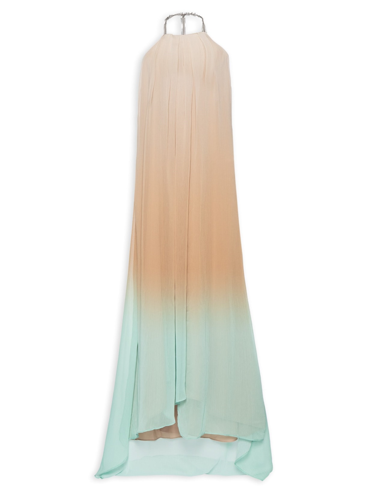 O vestido bege é confeccionado em tecido leve sem elasticidade. A peça solta ao corpo, de modelo frente única, possui decote trapézio com tira metalizada, recorte frontal sobreposto, tira metalizada na parte posterior, efeito degrade em cor contrastante, forro, barra assimétrica, comprimento longo e fechamento lateral por zíper invisível.