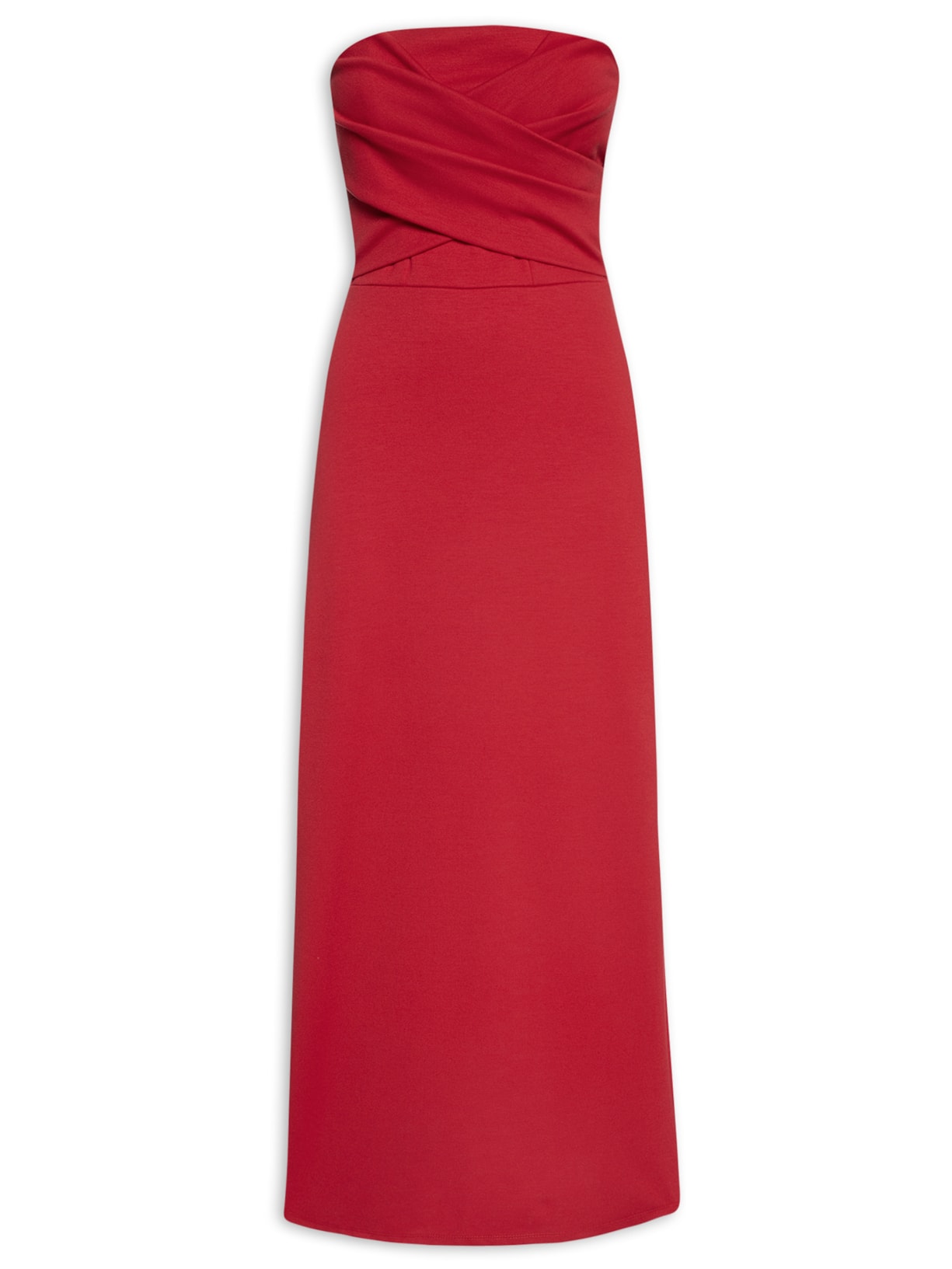 O vestido vermelho é confeccionado em malha de média elasticidade. A peça justa ao busto e solta no comprimento de modelo tomara que caia possui decote reto, parte superior com detalhe de tiras médias transpassadas, recortes frontais, aplicação posterior de lastex, fenda posterior, forro superior, comprimento midi e fechamento posterior por zíper invisível.
