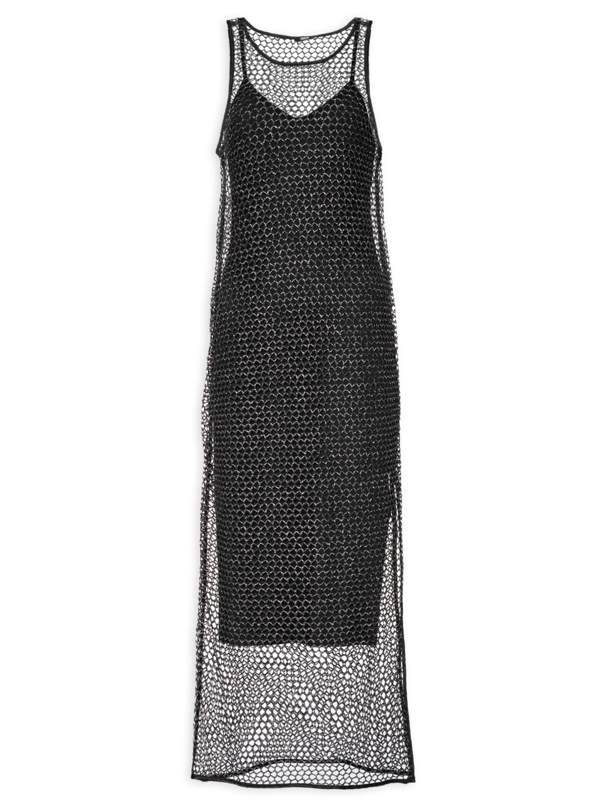 O vestido preto é confeccionado por tricot com superfície metalizada  com média elasticidade. A peça solta ao corpo possui decote redondo, alças médias, fendas laterais, transparecia e comprimento midi. Acompanha forro removível, possui decote V, alças finas, fenda lateral e comprimento midi.