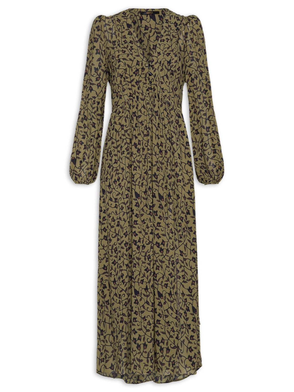 O vestido verde é confeccionado em tecido leve sem elasticidade. A peça solta ao corpo possui decote V profundo com tiras finas, mangas longas com ajuste nos punhos, recorte na cintura com franzidos, forro, fenda lateral, estampa floral em cores contrastantes, comprimento midi e fechamento frontal por botões.