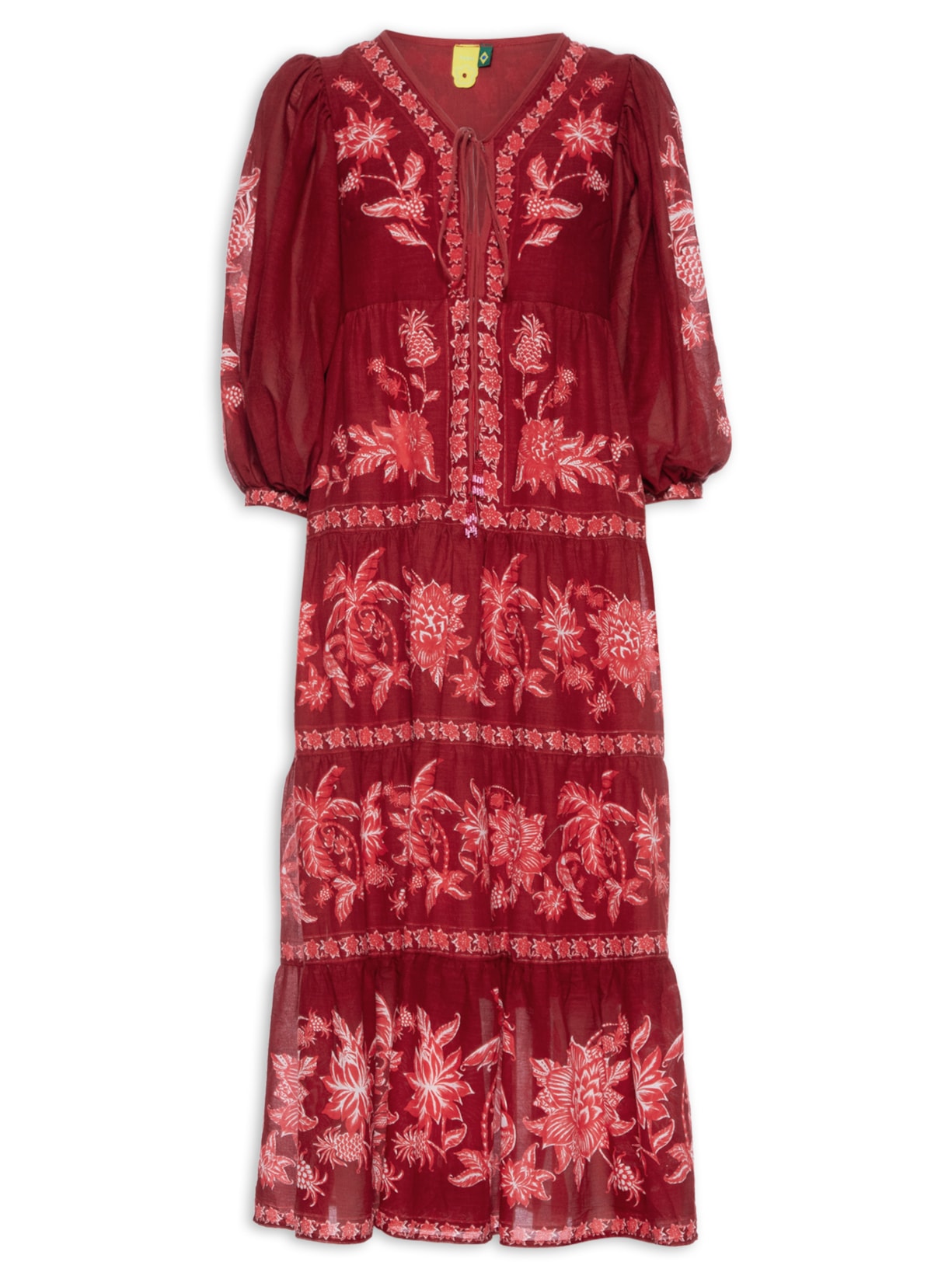 O vestido vermelho é confeccionado em tecido leve sem elasticidade. A peça solta ao corpo possui decote V com tiras estendidas para amarração, mangas 3/4, padronagem floral e comprimento midi.