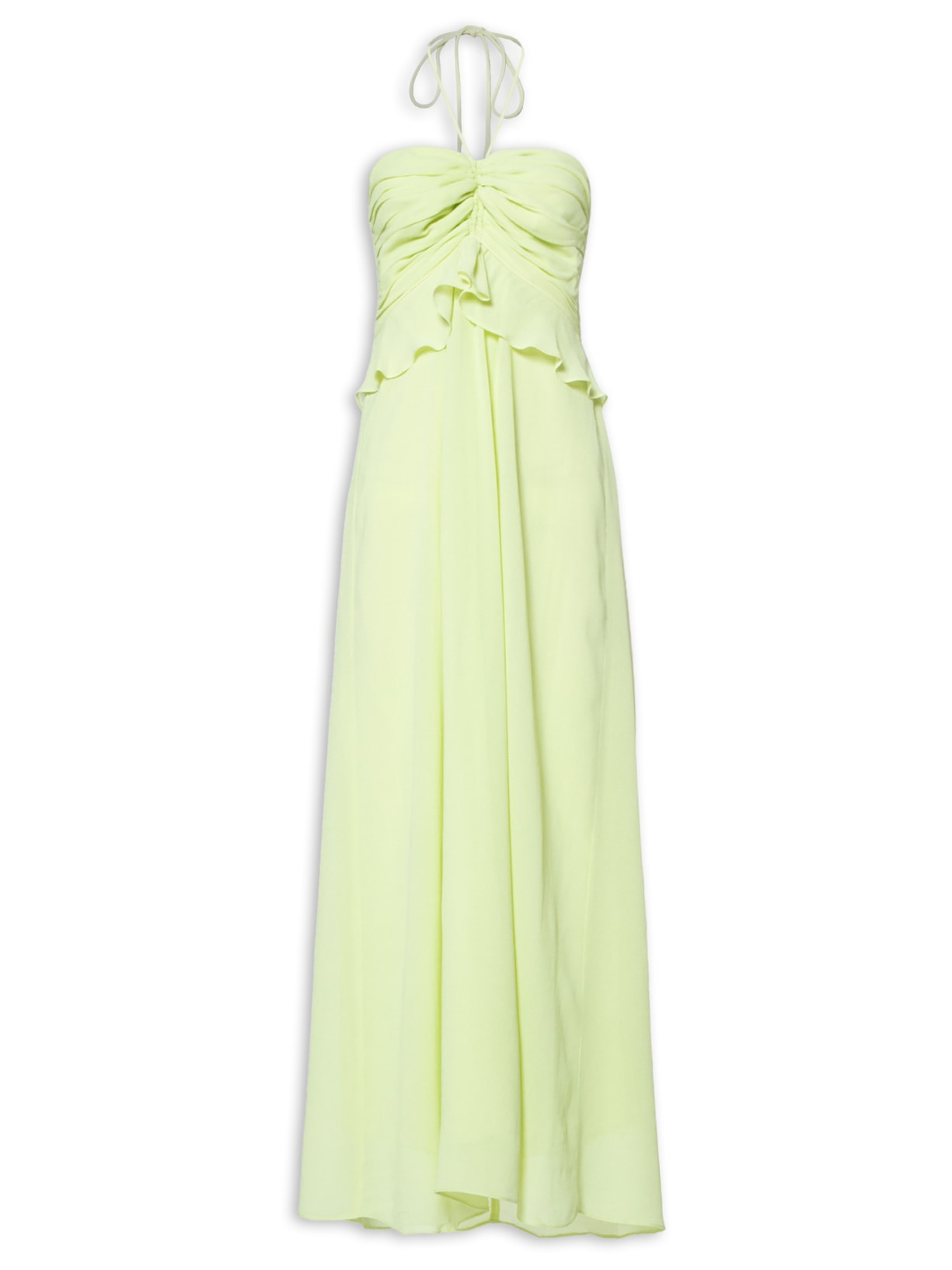 O vestido verde é confeccionado em tecido leve com superfície texturizada e sem elasticidade. A peça justa ao busto e solta no comprimento possui decote reto, alças finas alongadas embutidas na parte frontal para ajuste e amarração posterior, pregas laterais, recorte sobreposto de babados na altura da cintura, leve transparência, forro, sem bojo, comprimento midi e fechamento posterior por zíper invisível.