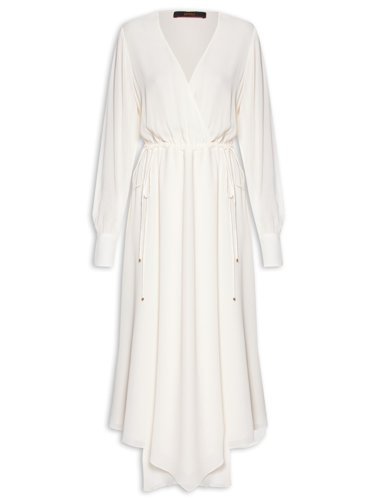 O vestido off white é confeccionado em crepe sem elasticidade. A peça solta ao corpo possui decote V transpassado, mangas longas com abotoamento nos punhos, leve transparência, elástico e cordão embutido na altura da cintura para amarração frontal, recorte frontal transpassado com fenda, assimetria na parte frontal e comprimento midi.