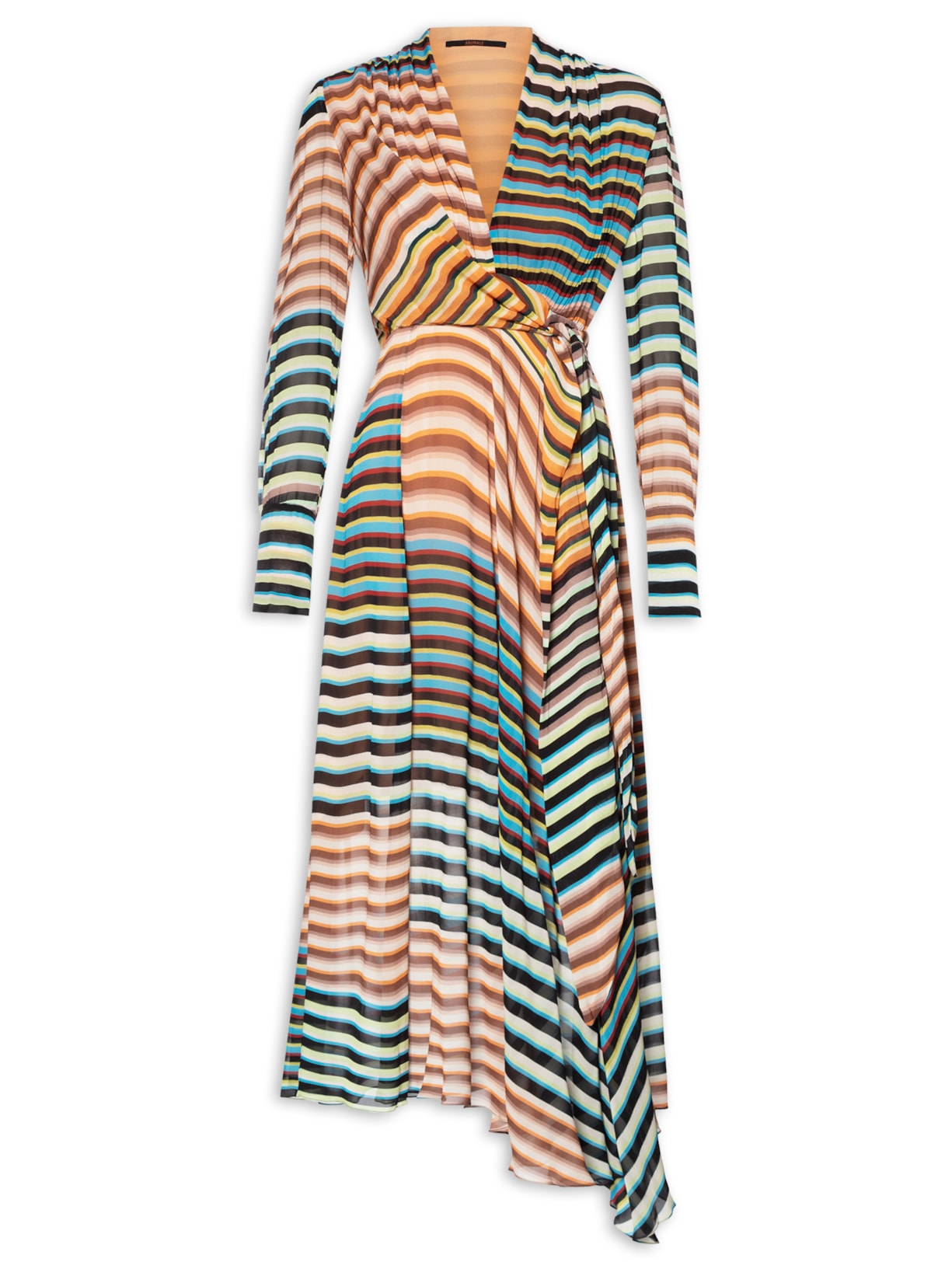 O vestido verde é confeccionado em tecido leve sem elasticidade. A peça solta ao corpo possui decote V, mangas longas com abotoamento nos punhos, recorte frontal com efeito franzido, parte frontal e posterior com tira alongada para amarração lateral, padronagem listrada em cores contrastantes, transparência, forro, comprimento midi e fechamento lateral por zíper invisível e botões.