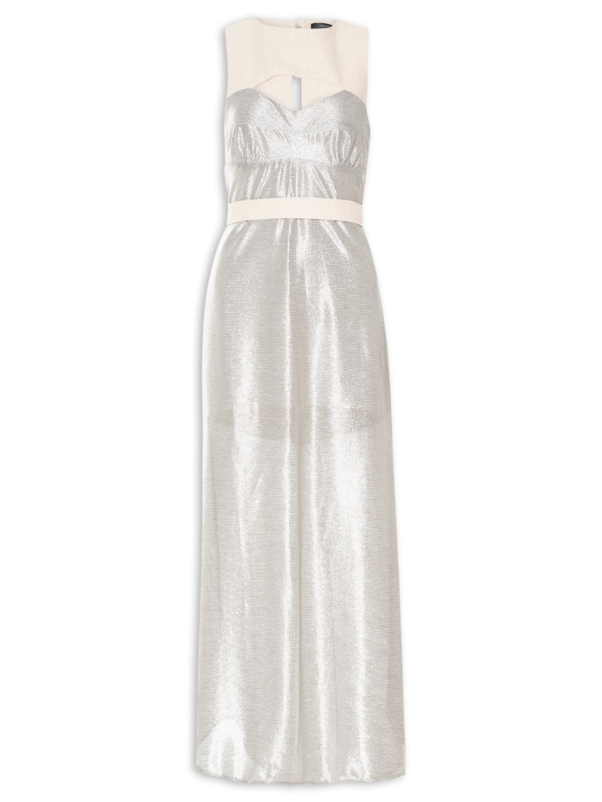 O vestido prata é confeccionado em malha leve com superfície metalizada e fios de lurex com baixa elasticidade. A peça justa no busto e solta no corpo possui decote redondo com recorte posterior vazado com fechamento por botão metalizado, alças largas, cavas estendidas, recorte superior em tecido com superfície texturizada, recorte frontal vazado, recorte com detalhes de franzidos na altura da cintura, meio forro, leve transparência, comprimento midi, barra arredondada e fechamento posterior por zíper invisível. Acompanha faixa em tecido leve com superfície texturizada com fechamento por botões para uso opcional.