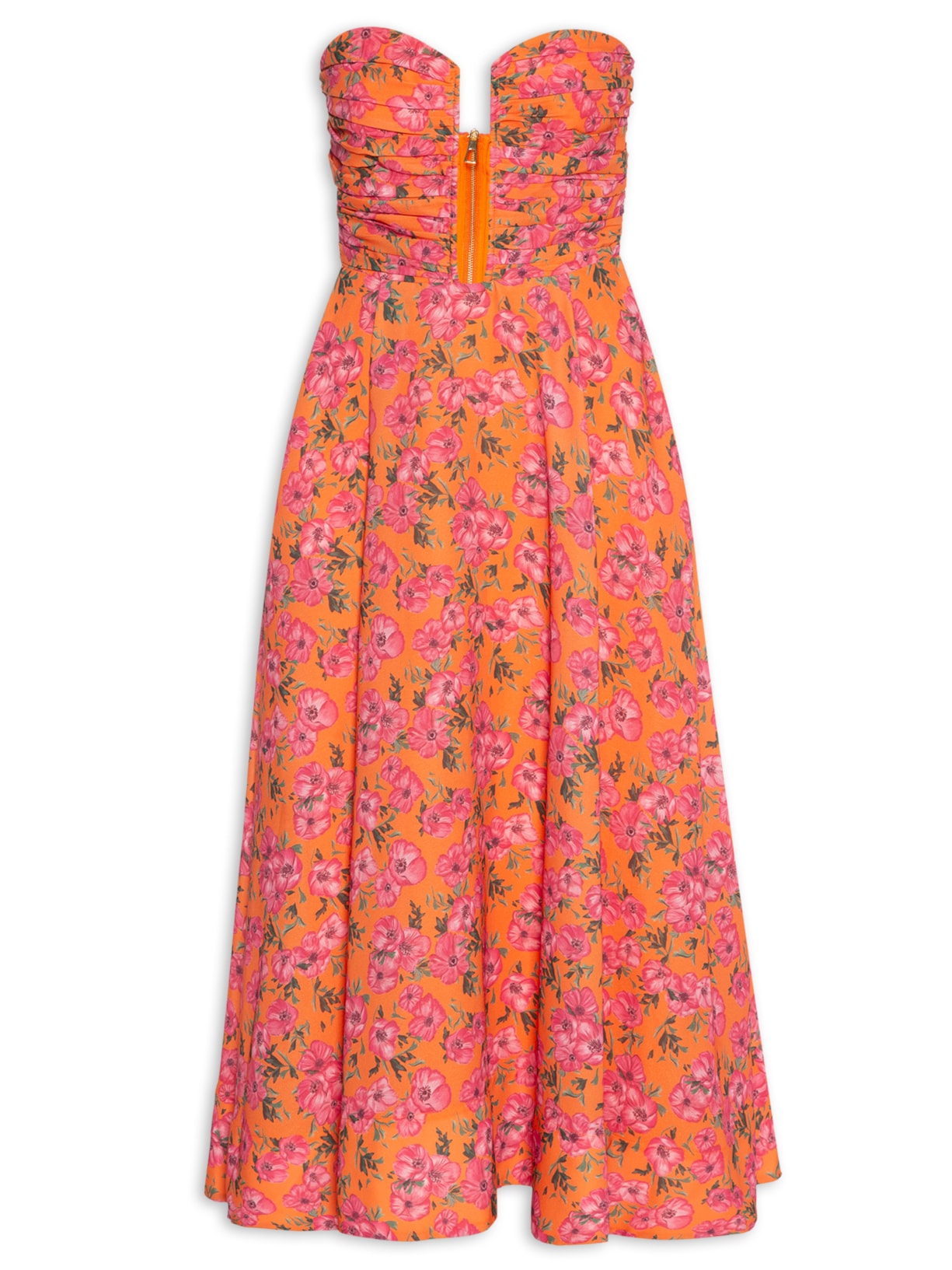 O vestido laranja é confeccionado em crepe sem elasticidade. A peça de modelo tomara que caia justa na altura do busto e da cintura e solto no comprimento possui decote coração com recorte em U profundo com aro metálico embutido, recorte posterior, detalhe de franzidos e pregas nas partes posterior e frontal na altura do busto e da cintura, sem bojo, estampa floral em cores contrastantes, forro, comprimento midi e fechamento posterior por zíper.