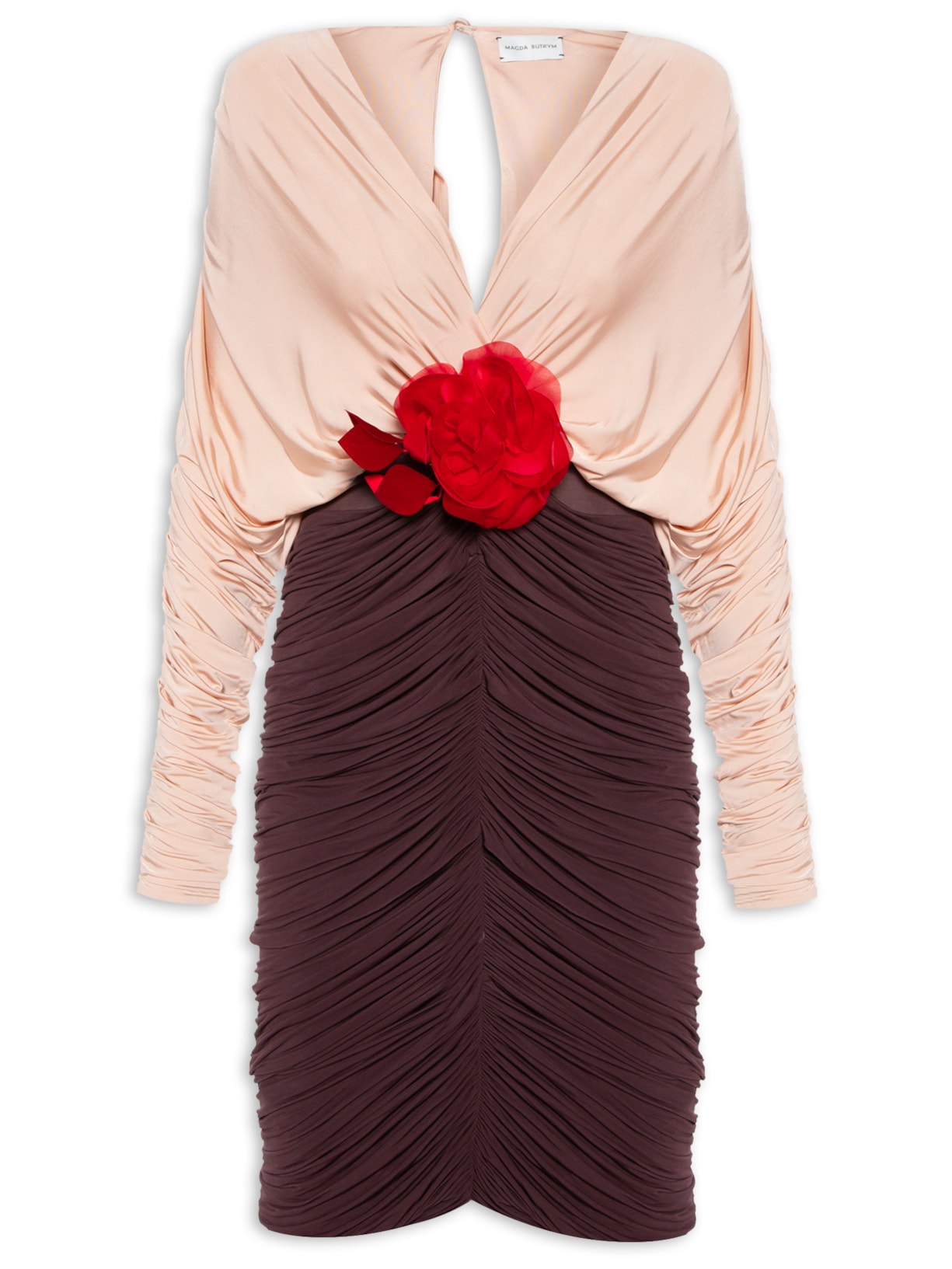 O vestido marrom é confeccionado em malha leve de alta elasticidade. A peça solta no e justa na parte inferior, possui decote em V profundo, mangas longas de modelo morcego com franzido na parte superior e ombros, parte superior em malha na cor bege, elástico embutido na cintura, aplicação de maxi flor vermelha em broche removível na parte frontal, franzido na parte frontal e posterior da saia, leve transparência inferior, recorte vazado na parte posterior, comprimento midi, forro e fechamento posterior por botão forrado e zíper invisível.