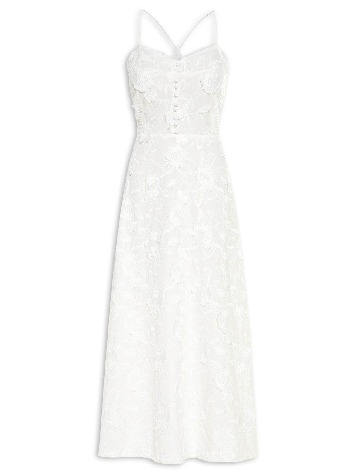 O vestido off white é confeccionado em tecido leve. A peça de modelo frente única possui decote coração, alças finas alongadas, cruzadas e reguláveis por amarração posterior, recortes posteriores vazados, bordado floral com detalhe de franja, recorte frontal com botões aplicados, forro, comprimento midi e shape solto.