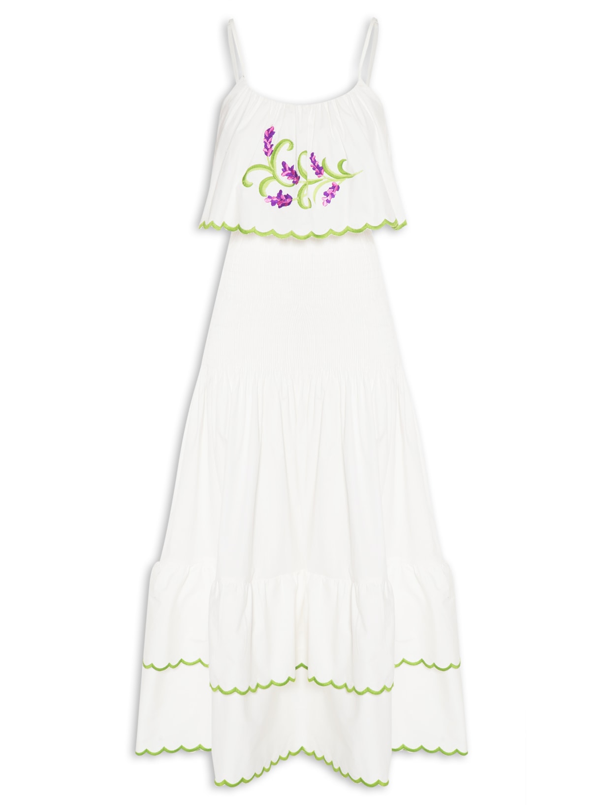 O vestido off white é confeccionado em tecido leve. A peça possui decote quadrado, alças finas ajustáveis, pala frontal e posterior sobreposta com bordados florais e bordas onduladas em tom contrastante, detalhes frontais e posteriores franzidos, recorte frontal e posterior em lastex, barra com aplicação de babados em camadas com bordas onduladas em tom contrastante, caimento reto, comprimento midi e acabamento pespontado.