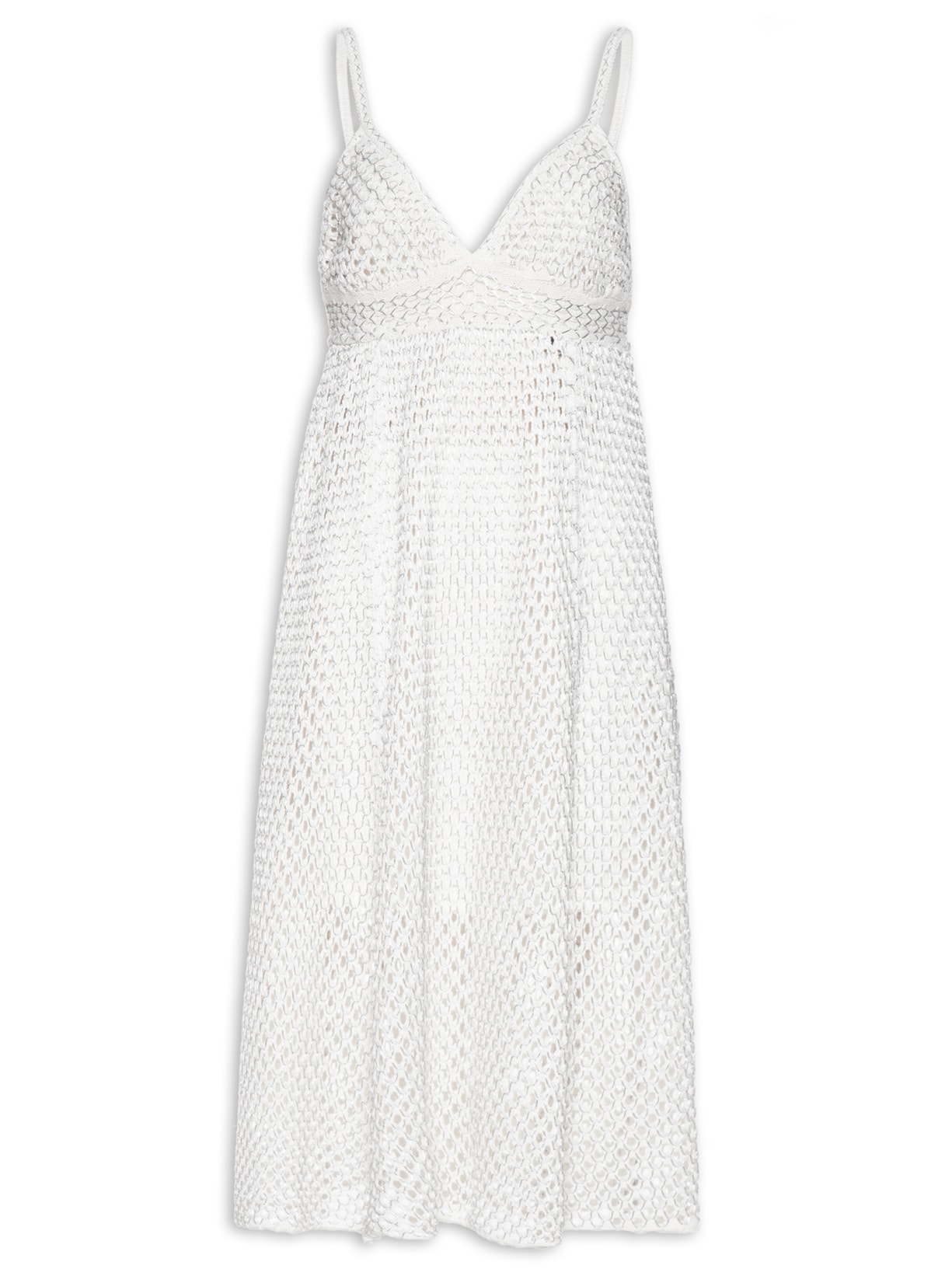 O tricot ressurge em tramas e modelagens marcantes para compor os seus visuais com muitocharme e sofisticação. Aposte no vestido da Bo.Bô ao lado da sandália lace up, colar e brincos para finalizar.