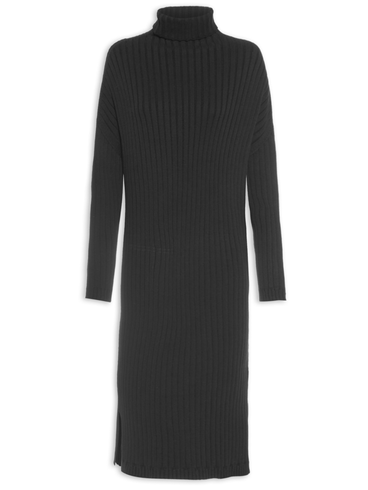 O vestido preto é confeccionado em tricot. A peça possui gola alta, ombros estendidos, mangas longas, fendas laterais, comprimento midi, shape justo, caimento reto e acabamento canelado.