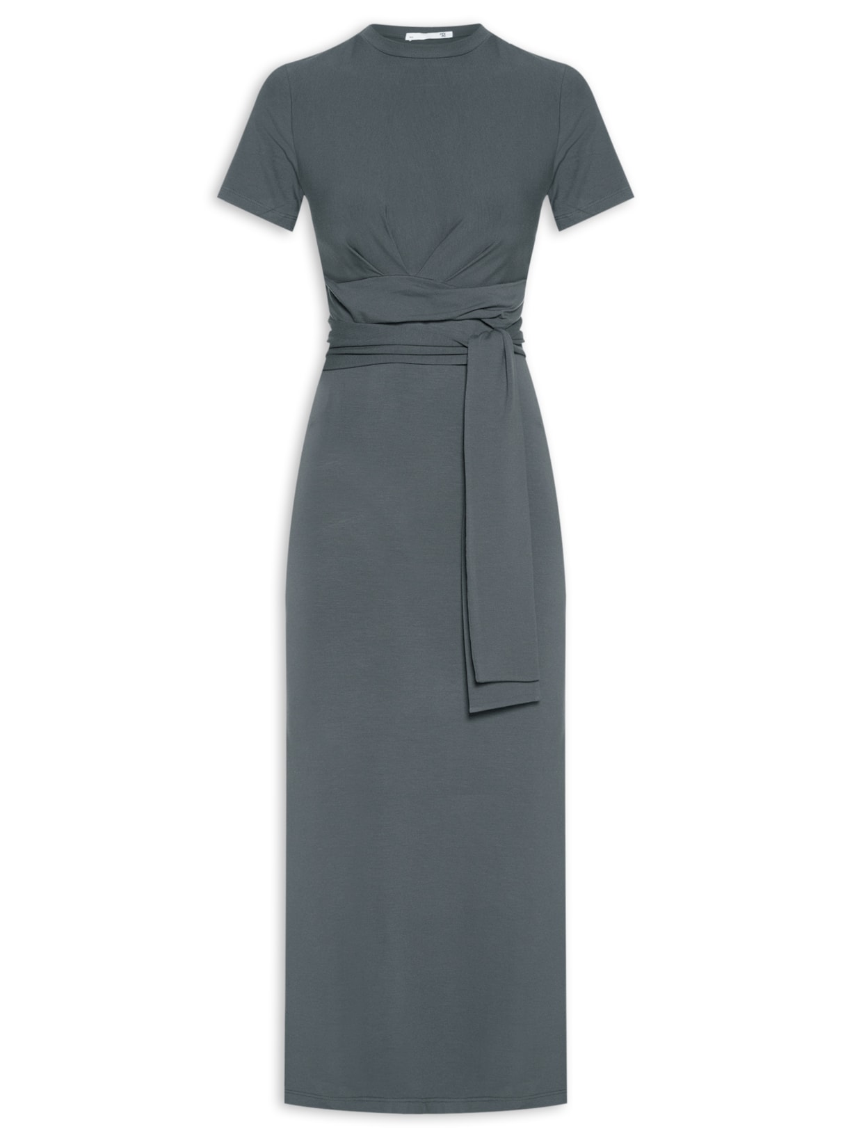 O vestido cinza é confeccionado em malha de média elasticidade. A peça justa ao corpo possui decote redondo, mangas curtas, recorte frontal na altura da cintura com pregas e tiras alongadas aplicadas na lateral para amarração, fenda lateral e comprimento midi.