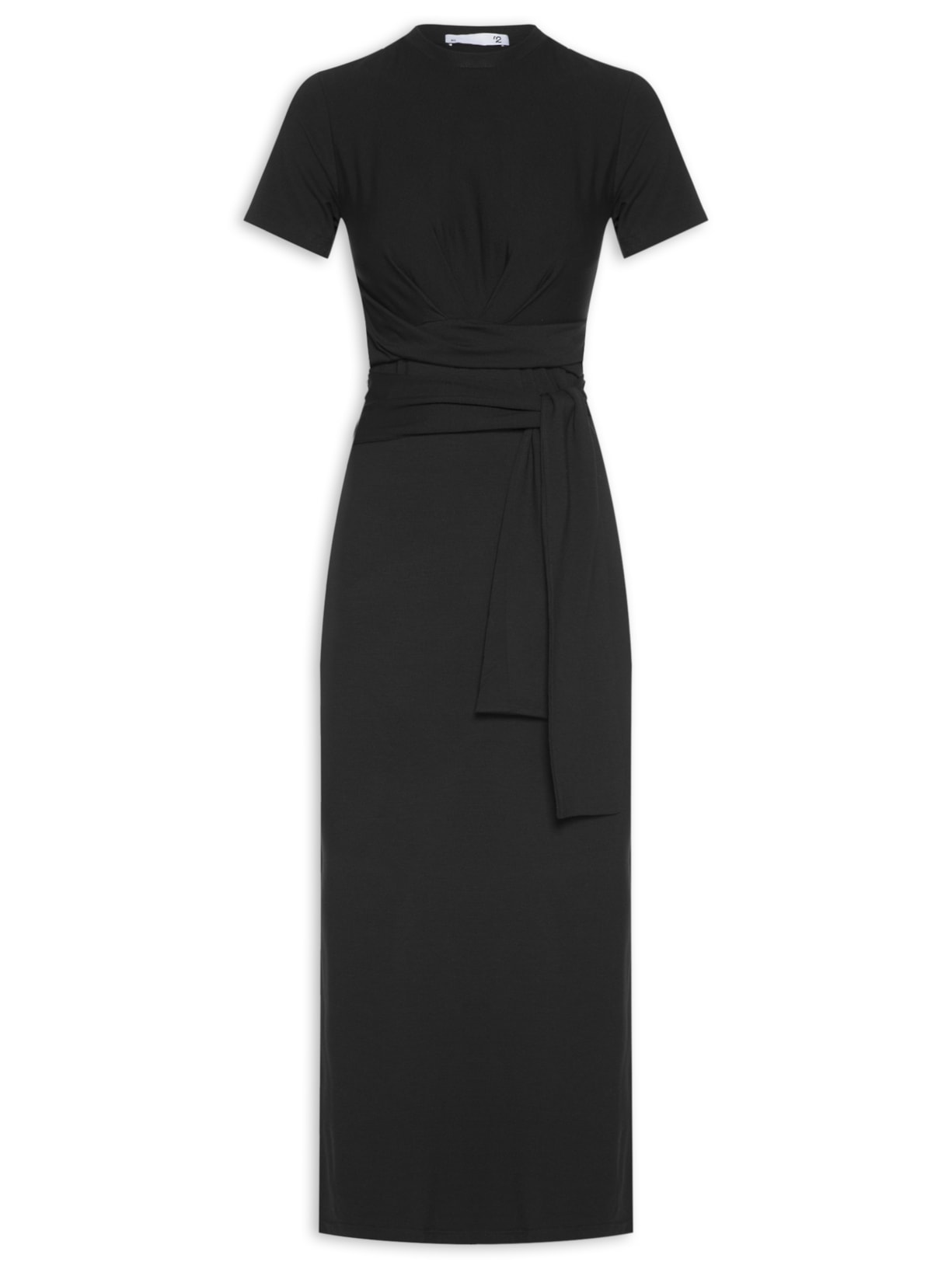 O vestido preto é confeccionado em malha de média elasticidade. A peça justa ao corpo possui decote redondo, mangas curtas, recorte frontal na altura da cintura com pregas e tiras alongadas aplicadas na lateral para amarração, fenda lateral e comprimento midi.