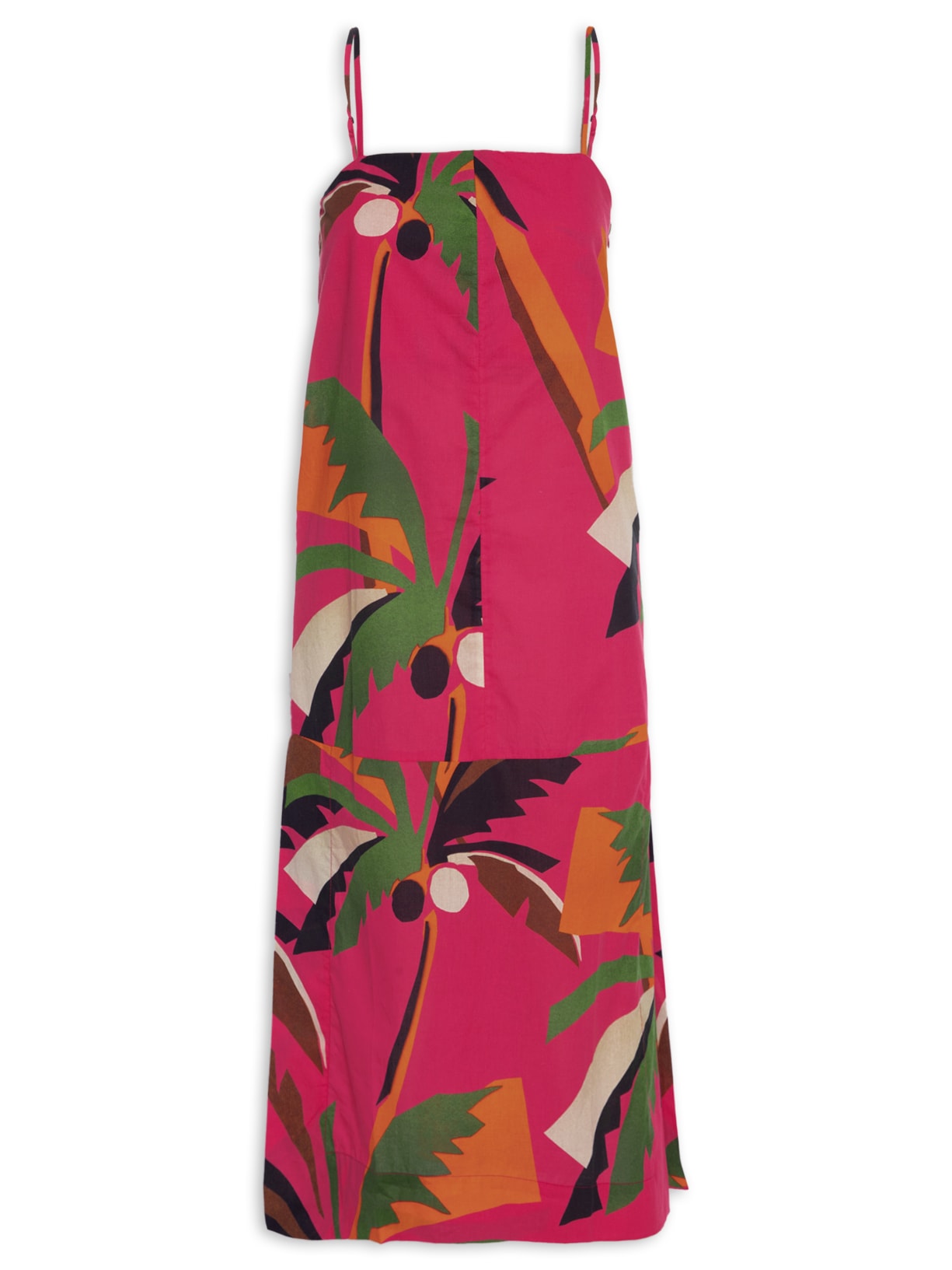 O vestido rosa é confeccionado em tecido leve sem elasticidade. A peça possui decote reto, alças finas reguláveis, forro superior, sem bojo, fendas laterais, estampa figurativa de coqueiros em tom contrastante, comprimento midi e fechamento lateral em zíper invisível.
