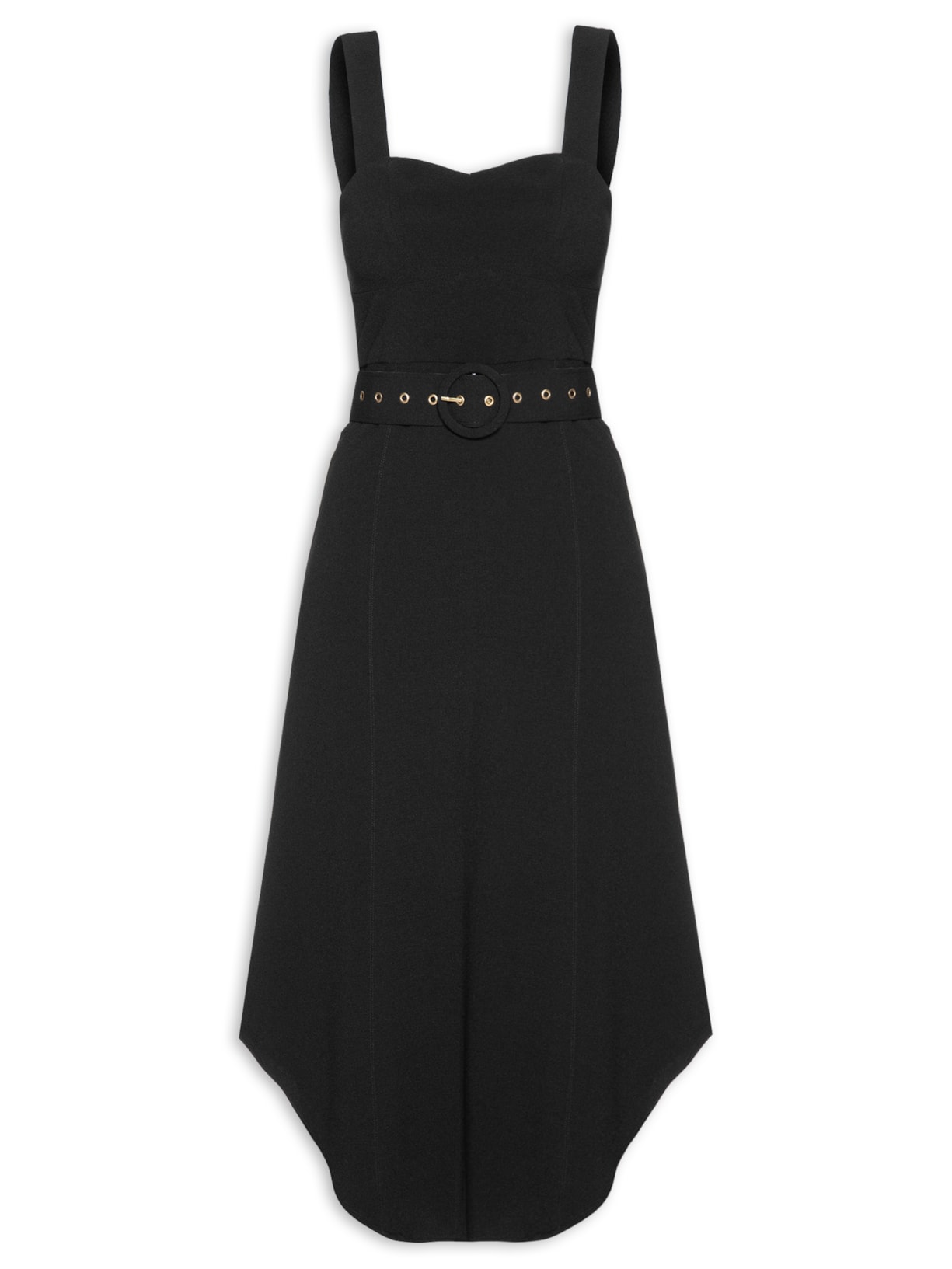 O vestido preto é confeccionado em crepe sem elasticidade. A peça justa na altura do busto e da cintura e solta no comprimento possui decote frontal coração e posterior quadrado, alças médias, cavas regulares, recorte posterior, recortes na altura do busto e da cintura, passantes aplicados nas partes laterais na altura da cintura, sem bojo, comprimeno midi, barra arredondada e fechamento posterior por zíper. Acompanha cinto largo forrado com o mesmo tecido, com 7 perfuros com ilhoses, passante e fechamento frontal por fivela regulável.