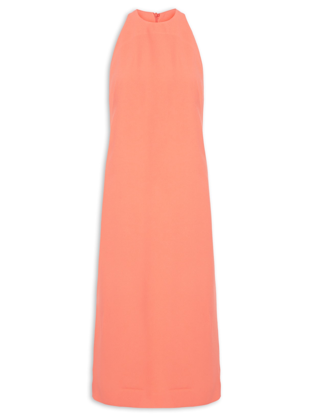 O vestido laranja é confeccionado em crepe sem elasticidade. A peça solta ao corpo possui decote posterior nadador e frontal trapézio, alças médias, cavas estendidos, fenda lateral, forro, comprimento midi e fechamento posterior por zíper invisível.