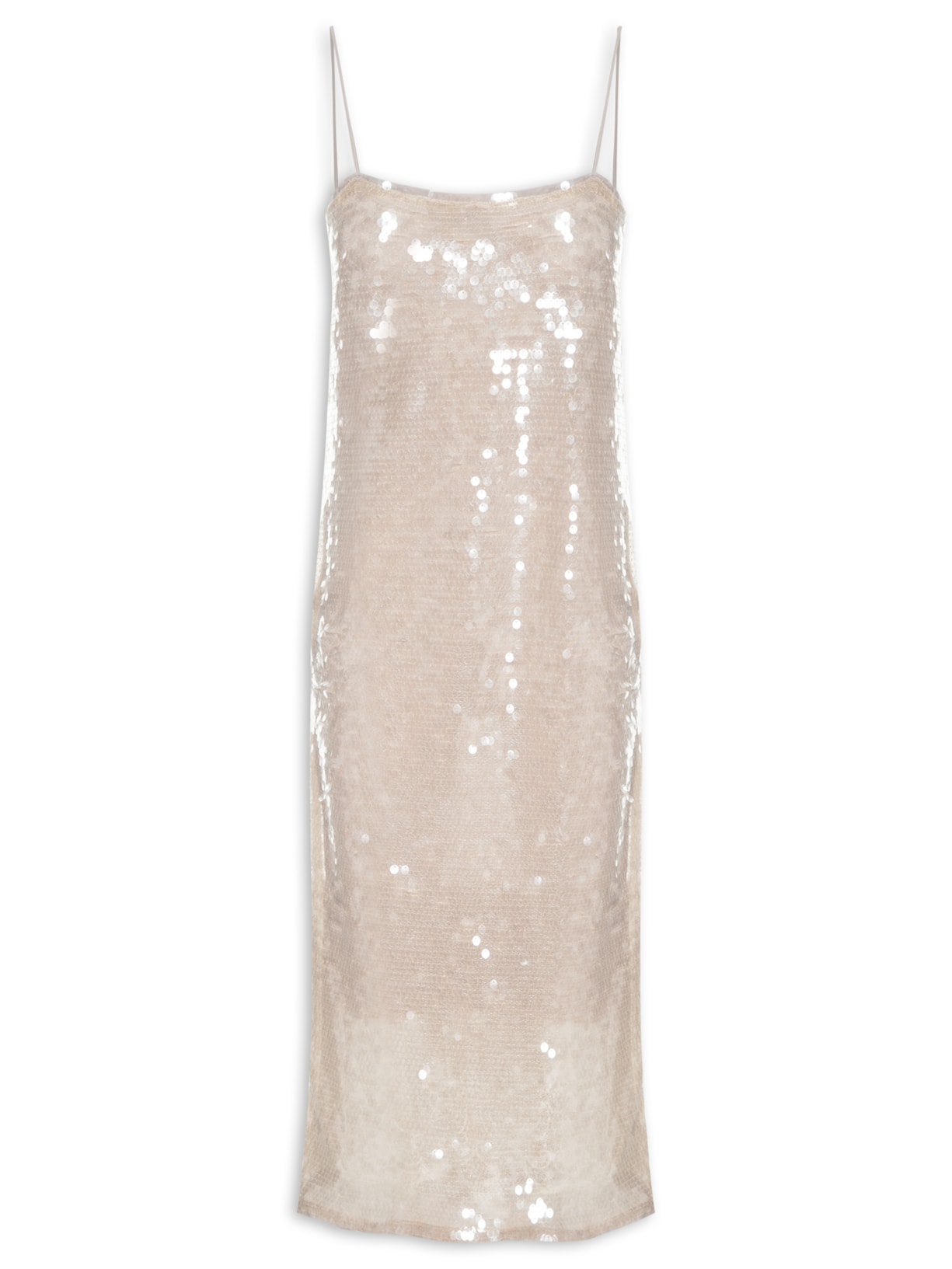 O vestido bege é confeccionado em tecido leve com superfície em paetês. A peça possui decote reto, alças finas, forro, comprimento midi, shape solto e fechamento lateral por zíper invisível.