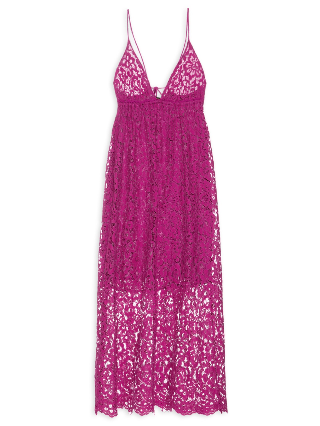 O vestido rosa é confeccionado em renda sem elasticidade. A peça justa na altura do busto e solta no comprimento possui decote frontal V profundo e posterior reto, alças finas alongadas para amarração posterior, cavas estendidas, sem bojo, elástico embutido na altura da cintura, meio forro, transparência, comprimento midi e sem fechamento.