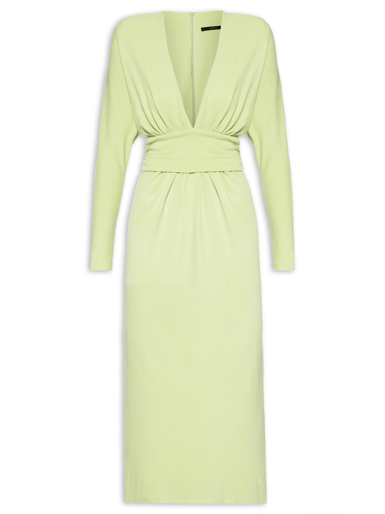 O vestido verde é confeccionado em crepe de alta elasticidade. A peça justa ao corpo e solta no comprimento possui decote V, mangas japonesas longas, recorte sobreposto com detalhe drapeado, efeito franzido, fenda posterior, parte frontal em tecido duplo, sem bojo, comprimento midi e fechamento posterior em zíper invisível.