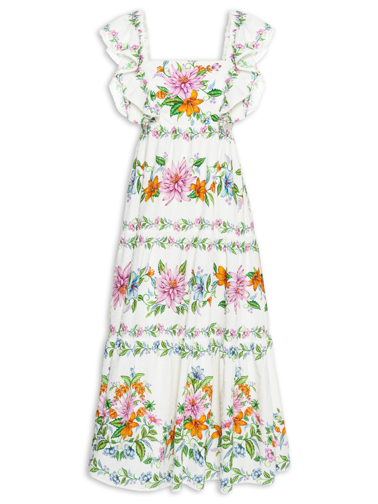 O vestido off white é confeccionado por tecido leve com superfície texturizada sem elasticidade. A peça solta ao corpo possui decote quadrado, mangas curtas no modelo borboleta, recortes sobre o comprimento com detalhes franzidos, padronagem floral em cor contrastante, forro, fechamento por amarração posterior e comprimento midi.