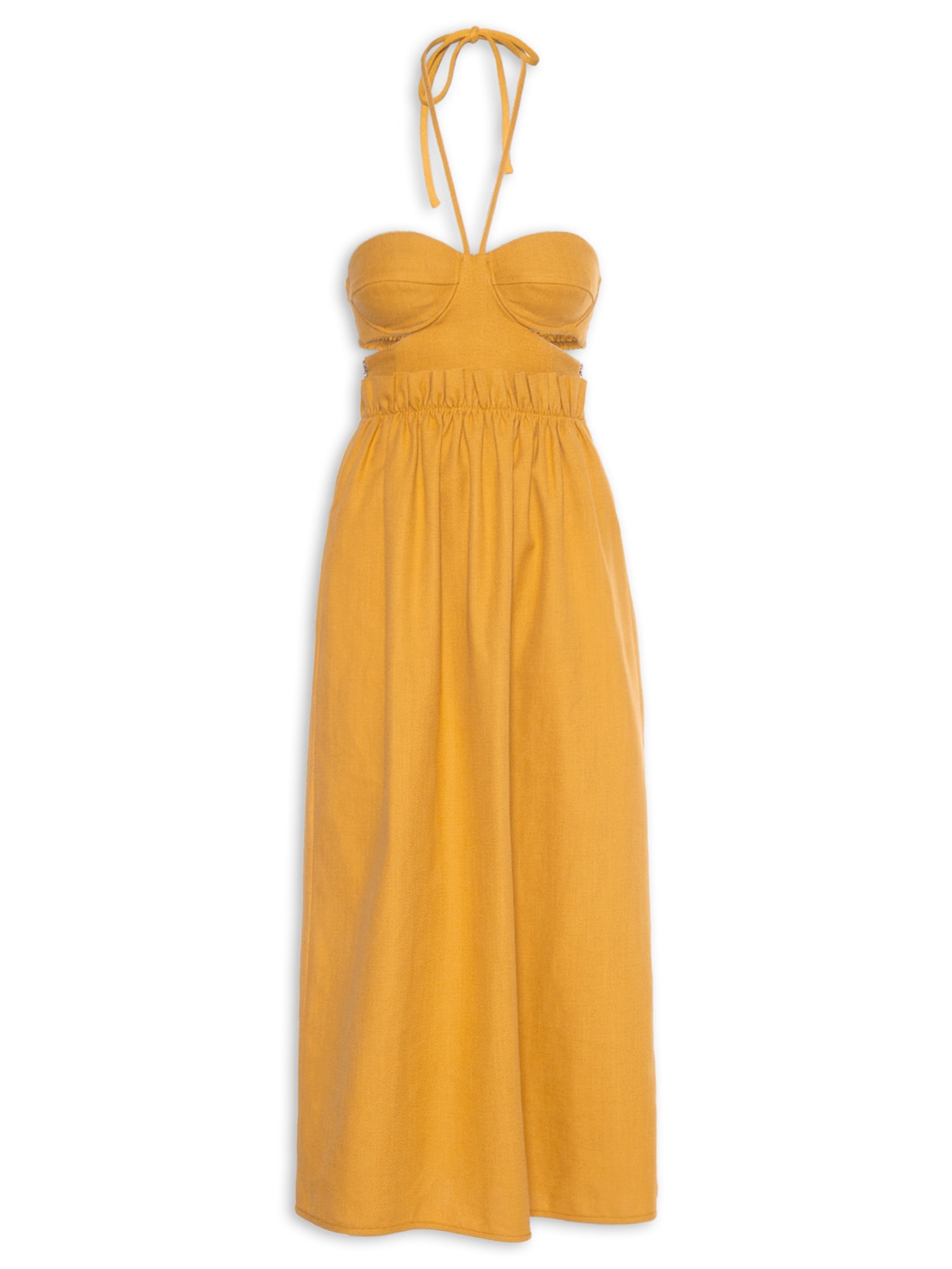 O vestido amarelo é confeccionado em sarka. A peça justa no busto e solta no corpo possui decote coração, alças em tiras finas estendidas para amarração posterior, recortes na altura do busto, recortes laterais vazados na altura da cintura, parte posterior com lastex embutido, detalhe de elástico embutido na cintura com babado aplicado, comprimento midi e fechamento lateral por zíper metalizado.