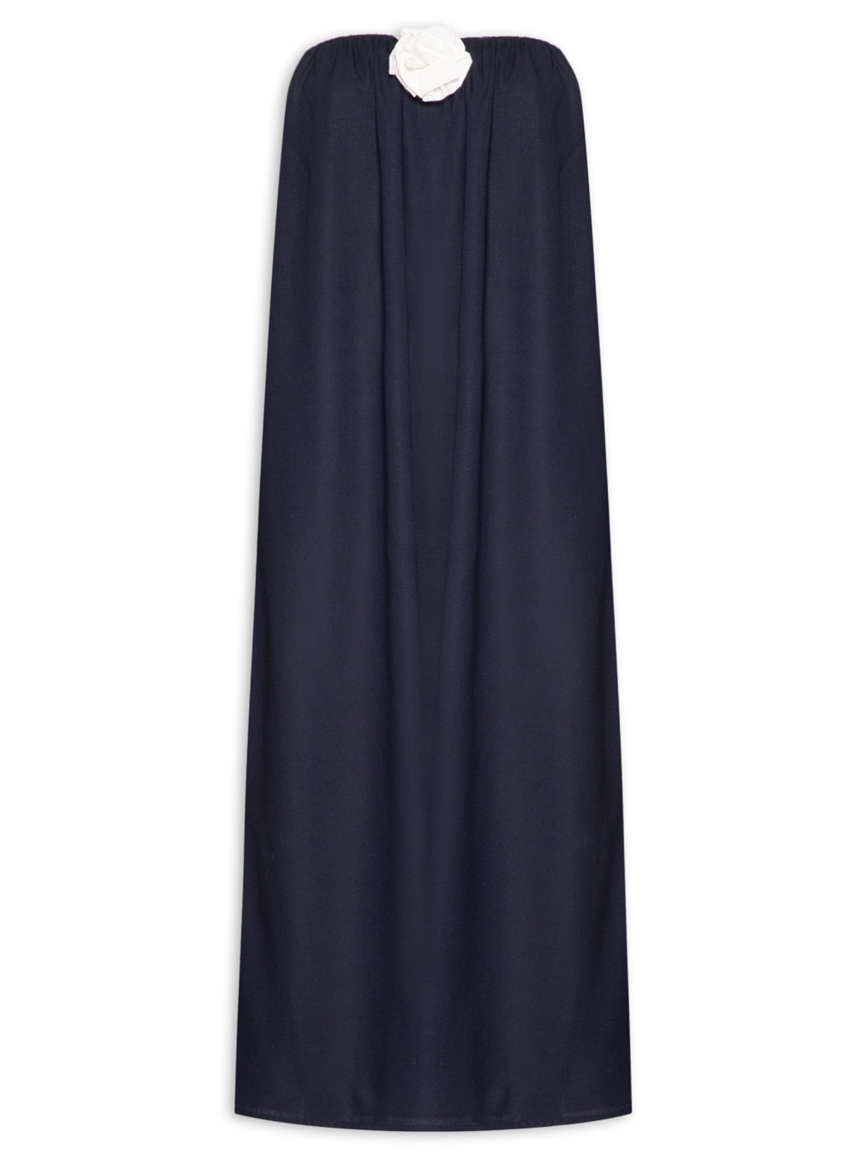 O vestido azul marinho é confeccionado em tecido leve com toque de linho sem elasticidade. A peça solta ao corpo de modelo tomara que caia possui decote reto, bolsos frontais embutidos, flor removível aplicada na parte frontal na cor branca, comprimento midi e fechamento lateral por zíper invisível.