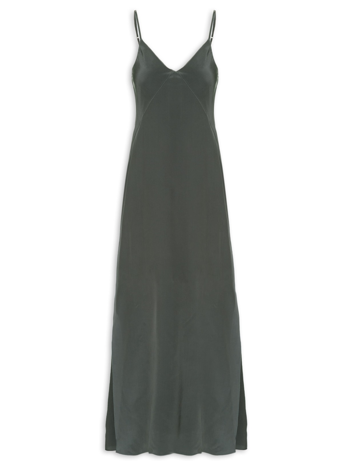 O vestido cinza é confeccionado em seda sem elasticidade. A peça solta ao corpo possui decote frontal e posterior V, alças finas com regulagem, cavas regulares, recortes posteriores e frontais, meio forro, fendas laterais, comprimento midi e não possui fechamento.